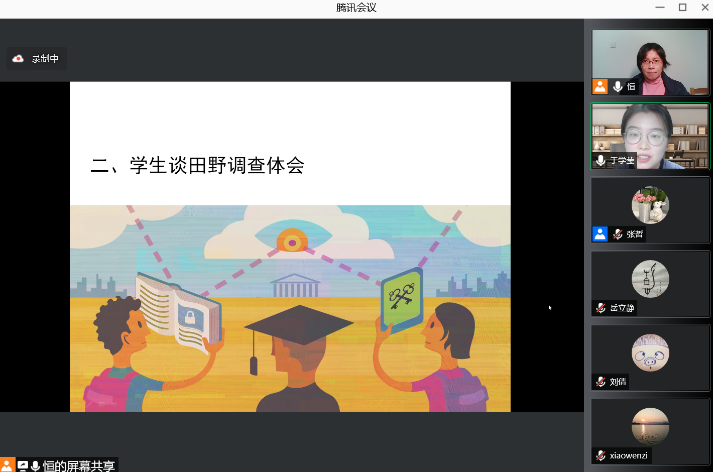 接下来,作为员工代表的于学莹讲述了自身参加田野调查的收获和体会。一方面,于学莹认为田野调查提升了自己的科研素养,田野调查不仅提升了科研水平,也对撰写相关调查报告和论文有所帮助。她的本科毕业论文和几篇课程论文,都是在田野调查的基础上完成的。她在第一次参与田野调查时,跟着老师和学姐记音,不光记得慢,还常常把国际音标和汉语拼音搞混。每天记完音就和学姐听着录音互相核对,导师也会时常检查记录材料,这样把原来的语言符号转化成可听可感的语音影像,多跑几次下来,才基本掌握了整个调查的流程,也掌握了论文写作的技巧和方法。总之,田野调查是语言学习的重要一环,有了实践类的课程,这样的语言学学习更加高效、便捷。