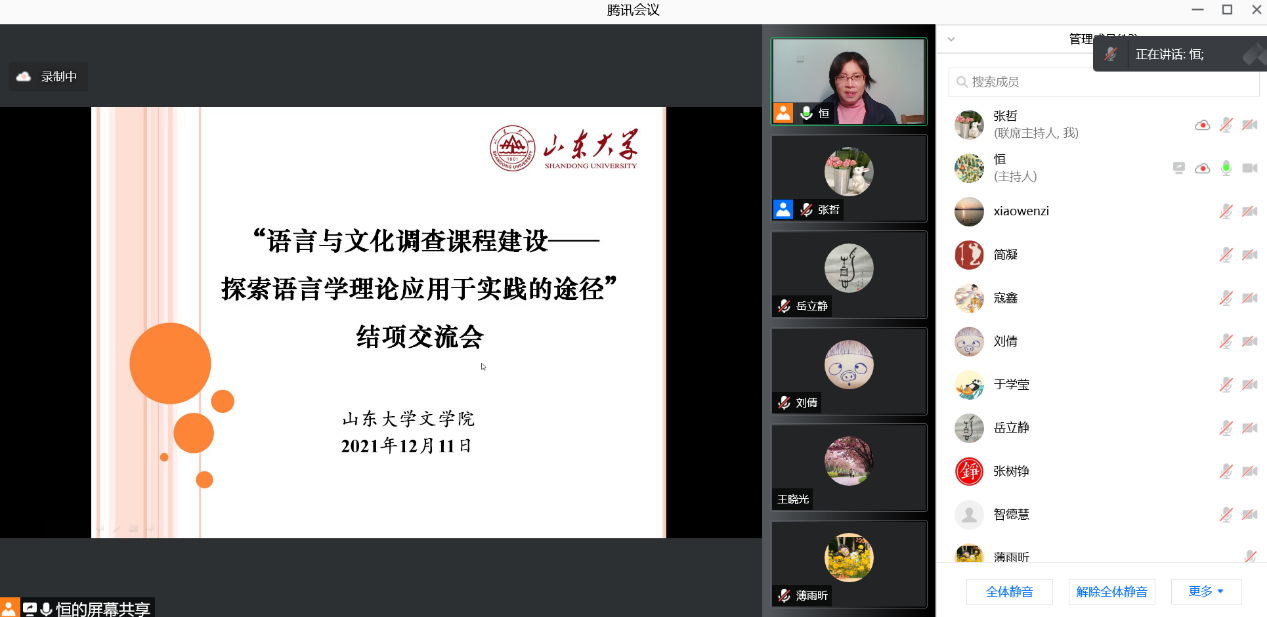 2021年12月11日晚,公司“语言与文化调查课程建设”结项交流会以网络会议方式顺利举行。本次交流会的目的是汇报教改项目“语言与文化调查课程建设”(张燕芬主持)的成果、经验并与同行专家交流。会议由张燕芬副教授主持,出席的专家有BEAT365英国官网网站威海校区刘倩副教授、青岛大学王晓光副教授、山东财经大学张春华副教授等,公司张树铮教授、岳立静教授及其他青年老师参加会议。