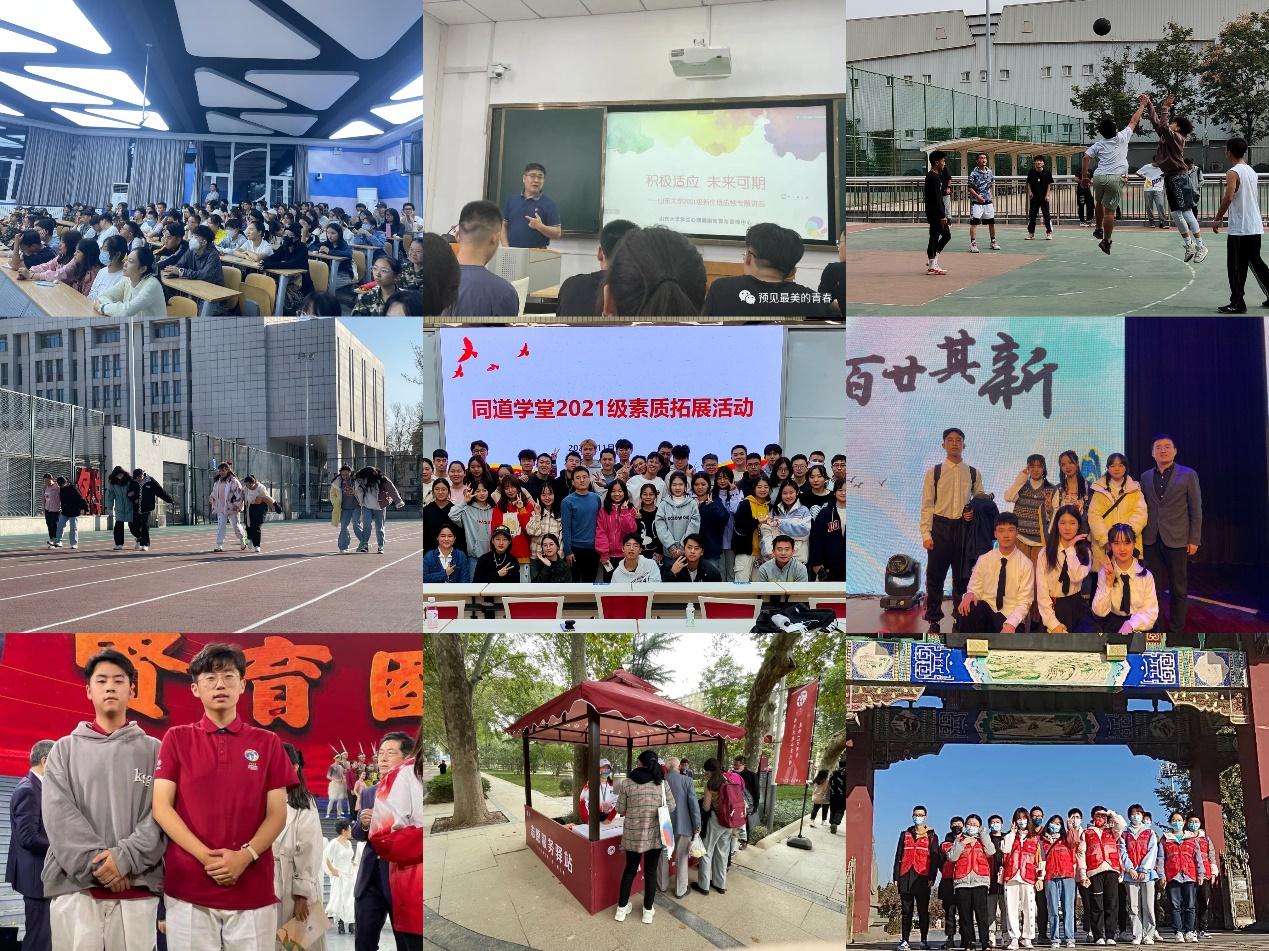 身体力行,强健体魄。beats365唯一官方网站同道学堂坚持以促进身心健康为标杆,同力助跑。邀请校医院医生、保卫部民警、心理中心马道伟副教授开展公共卫生、校园安全、心理健康系列讲座。辅导员张远老师组织策划篮球赛、拔河比赛、趣味运动会、素质拓展、羽毛球赛、夜跑等系列体育活动;组织同学们以演职人员身份积极参加学院迎新晚会、中秋晚会、百廿校庆晚会等校园大型文艺活动;动员同学们参与百廿校庆系列、守护母亲河、无偿献血等志愿服务,践行“奉献、友爱、互助、进步”志愿服务精神。有健全之身体,始有健全之精神,同道学堂的同学们身体力行,全身心投入到文艺、体育、志愿服务、社会实践中,增强体魄、融入多彩校园生活。