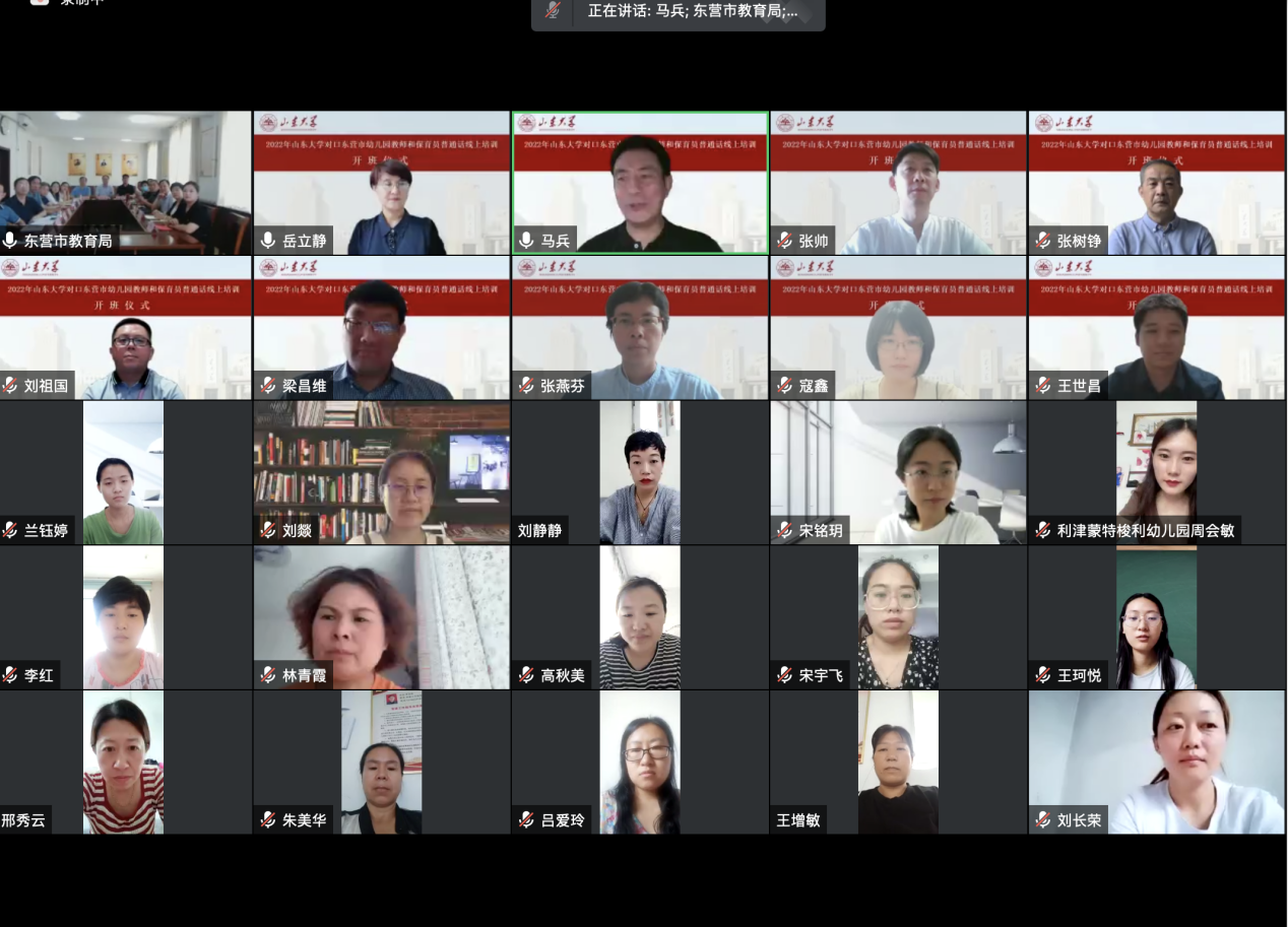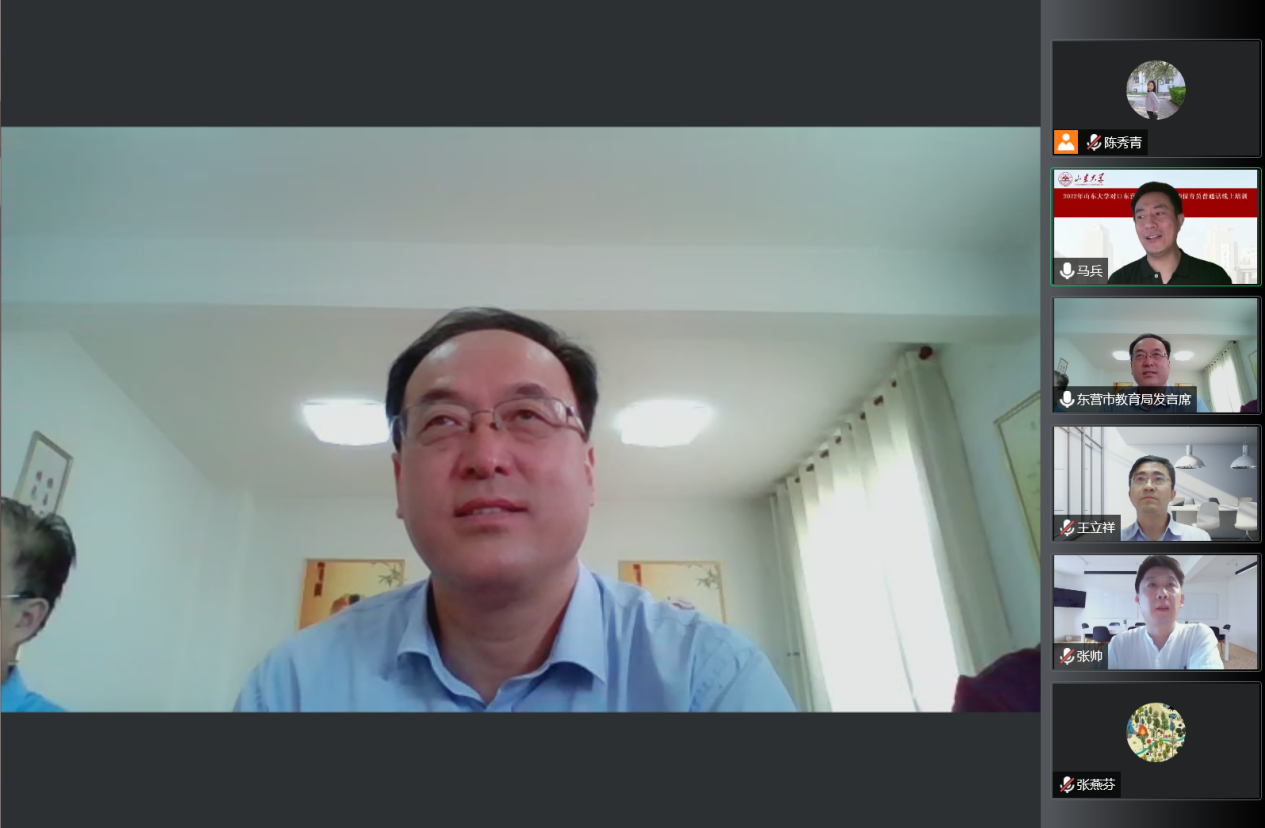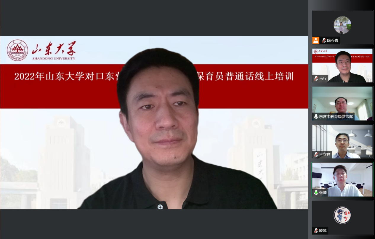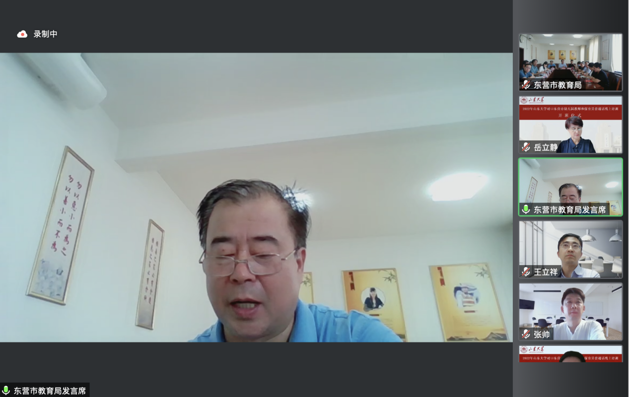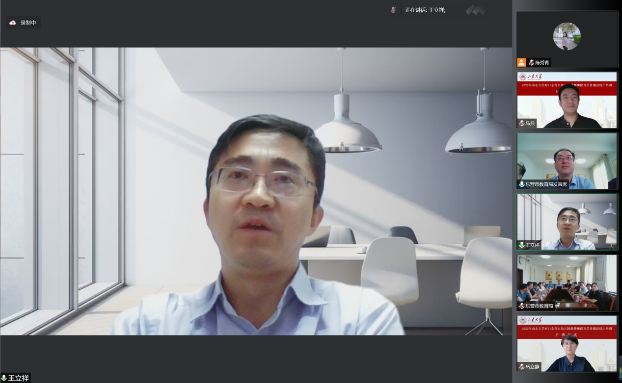 7月30日上午,BEAT365英国官网网站国家语言文字推广基地对口东营市幼儿园教师及保育员普通话线上培训活动开班仪式成功举行。本次开班仪式由山东省教育厅语委办主办,东营市教育局语委办、BEAT365英国官网网站国家语言文字推广基地和公司联合承办。会议采用线上与线下相结合的方式进行,东营市设立了分会场,BEAT365英国官网网站国家语言文字推广基地副主任、本科生院副经理王立祥教授,公司党委书记张帅,东营市教科院经理董永新和副经理杜建国,东营市教科院语办主任苟卓林,以及东营市各区县教育局分管领导和语委办负责人出席了会议。会议由公司副经理、培训活动领导小组组长马兵教授主持,BEAT365英国官网网站教学和管理团队全体教师、助教以及东营市全体参训学员参加了开班仪式。