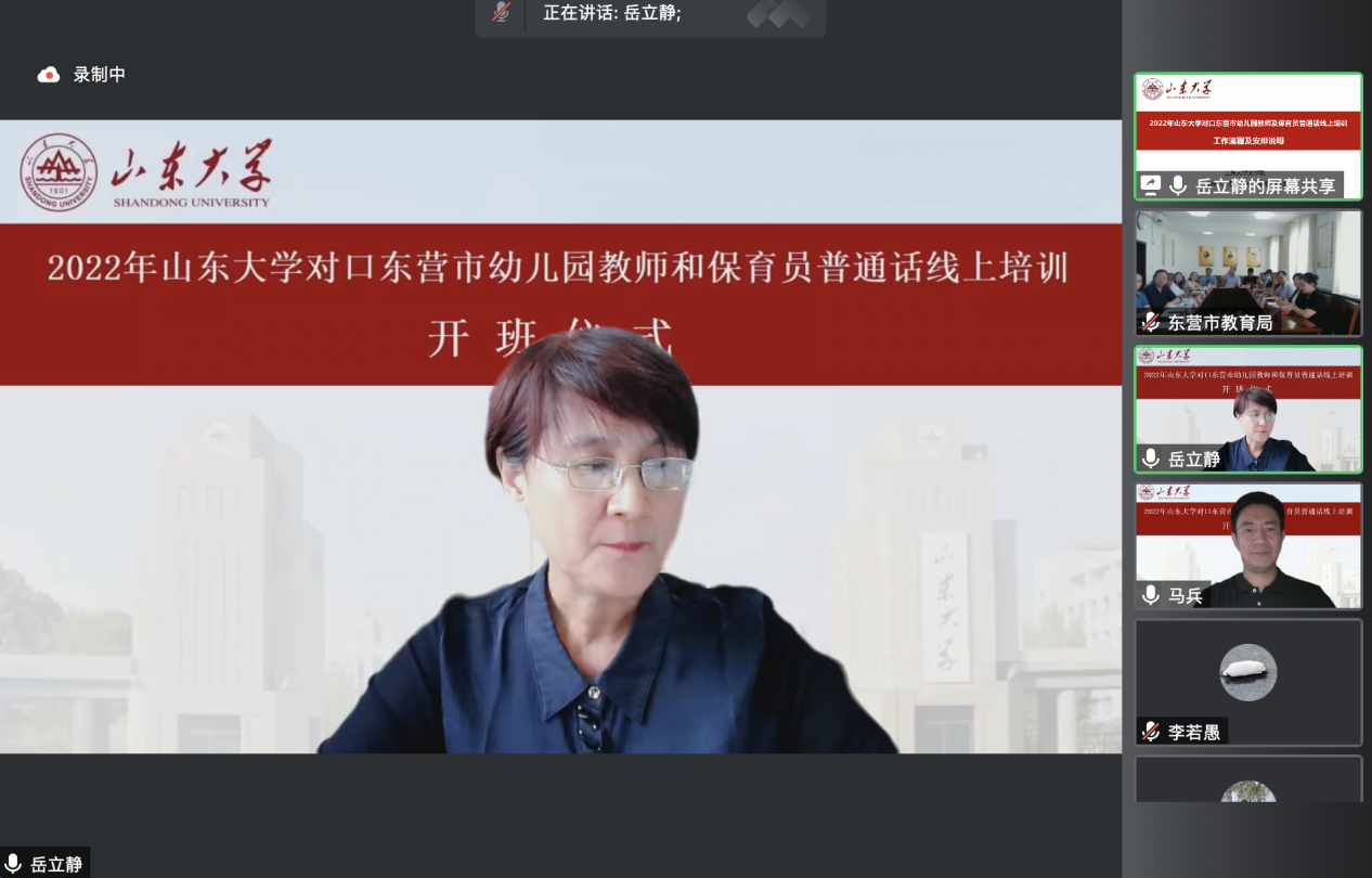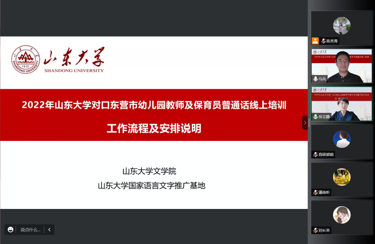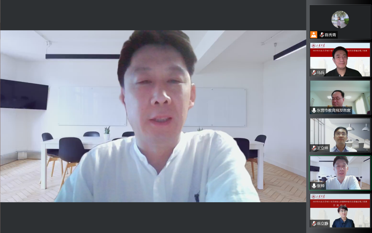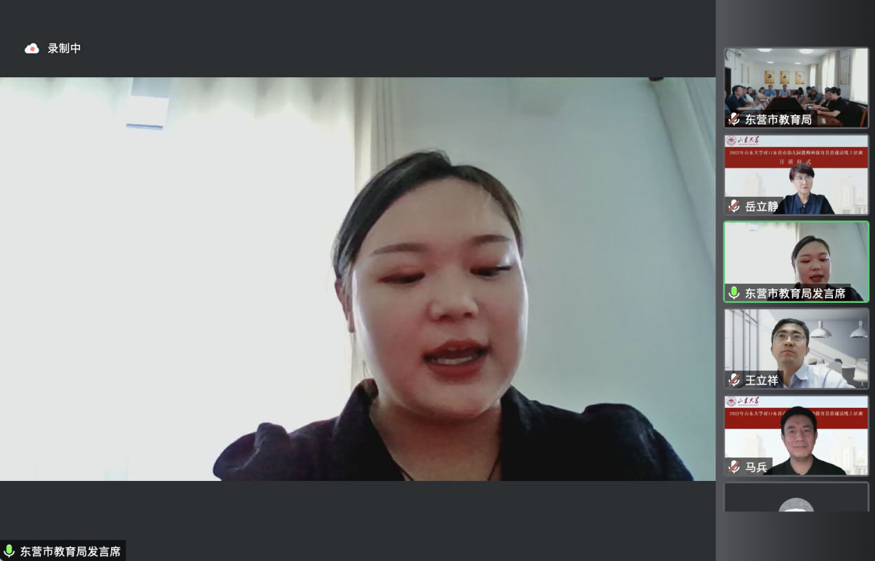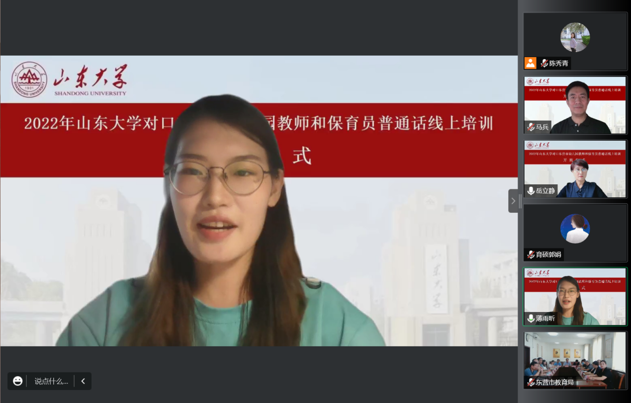 7月30日上午,BEAT365英国官网网站国家语言文字推广基地对口东营市幼儿园教师及保育员普通话线上培训活动开班仪式成功举行。本次开班仪式由山东省教育厅语委办主办,东营市教育局语委办、BEAT365英国官网网站国家语言文字推广基地和公司联合承办。会议采用线上与线下相结合的方式进行,东营市设立了分会场,BEAT365英国官网网站国家语言文字推广基地副主任、本科生院副经理王立祥教授,公司党委书记张帅,东营市教科院经理董永新和副经理杜建国,东营市教科院语办主任苟卓林,以及东营市各区县教育局分管领导和语委办负责人出席了会议。会议由公司副经理、培训活动领导小组组长马兵教授主持,BEAT365英国官网网站教学和管理团队全体教师、助教以及东营市全体参训学员参加了开班仪式。