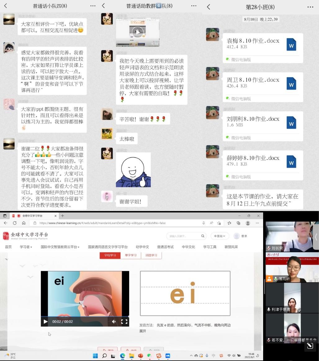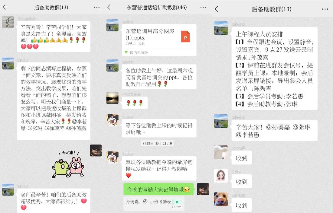 为保障培训活动有序进行,培训团队抽调部分助教组成一支后备助教小队,由公司汉语言文字学教研室刘祖国老师带队。带队老师负责统筹后备工作和教学督导,后备助教们主要负责会务工作、学员小班群建立及维护工作、学员大班、小班考勤工作、助教考核工作以及整个培训活动的宣传工作等。在普通话培训课程开班之前,各项准备工作便紧锣密鼓地进行,从培训学员名单的落实到开班仪式之前的设备调试,培训相关工作有条不紊地开展着。随着培训课程进入常态化阶段,带队老师和后备助教更多地充当了各个主体之间的沟通桥梁,切实将信息高效、及时地传递到各方主体,每节课后进行考勤上报、整理上传教学录屏链接,备份教学视频,与东营市相关部门负责人沟通对接,处理突发情况,保教学工作平稳运行。作为本次培训活动中的“一块砖”,后备助教与其他助教同心同行、共同努力,一起跟进普通话教学,真正做到了哪里需要往哪搬。