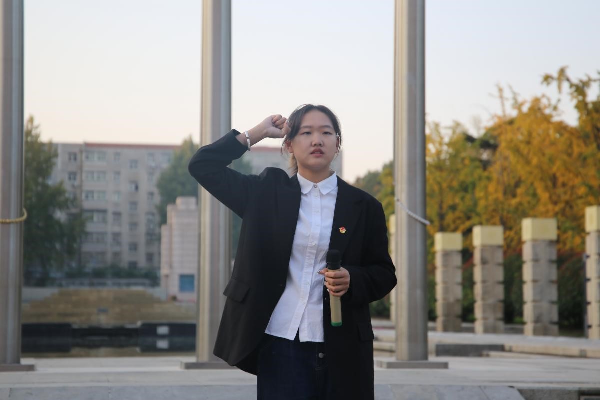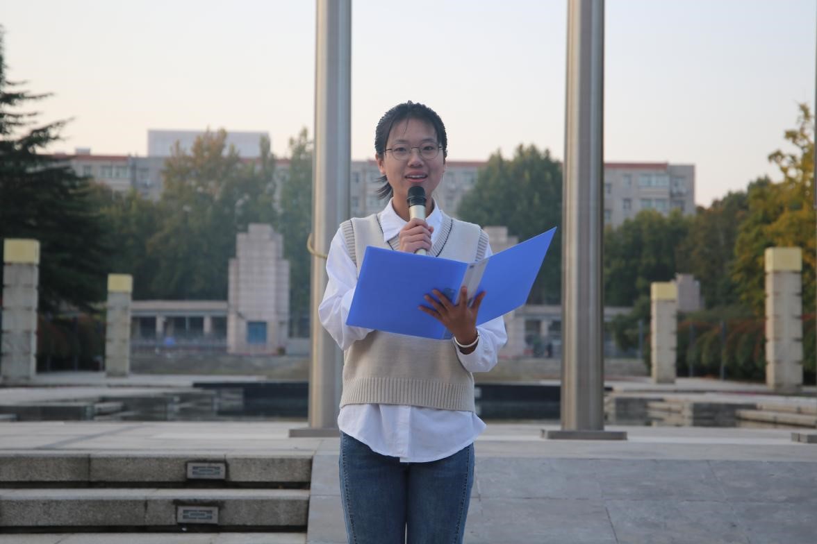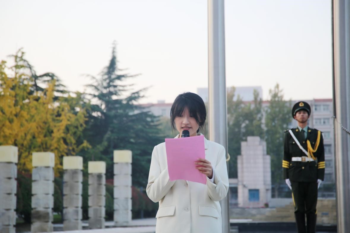 升旗仪式后,2022级中文一班张雅茹同学在国旗下进行了激情澎湃的演讲。她回顾了历代山大文院人用责任与智慧写就的辉煌业绩,并表示吾辈青年生逢盛世、重任在肩,必将接过前辈手中的火炬,砥砺奋进,不负韶华。她号召同学们在通过读书丰盈内心、提升自我的同时,秉持“功成不必在我,功成必定有我”的信念,探索跨学科发展的可能性,讲好新时代中国学术故事。同时,她呼吁同学们积极担当山大文院学子的责任使命,在平凡日子里默默奉献,在使命召唤下勇攀高峰,传承“重情义、尚风骨、尊学术”的优良传统,携手书写文院的崭新篇章。