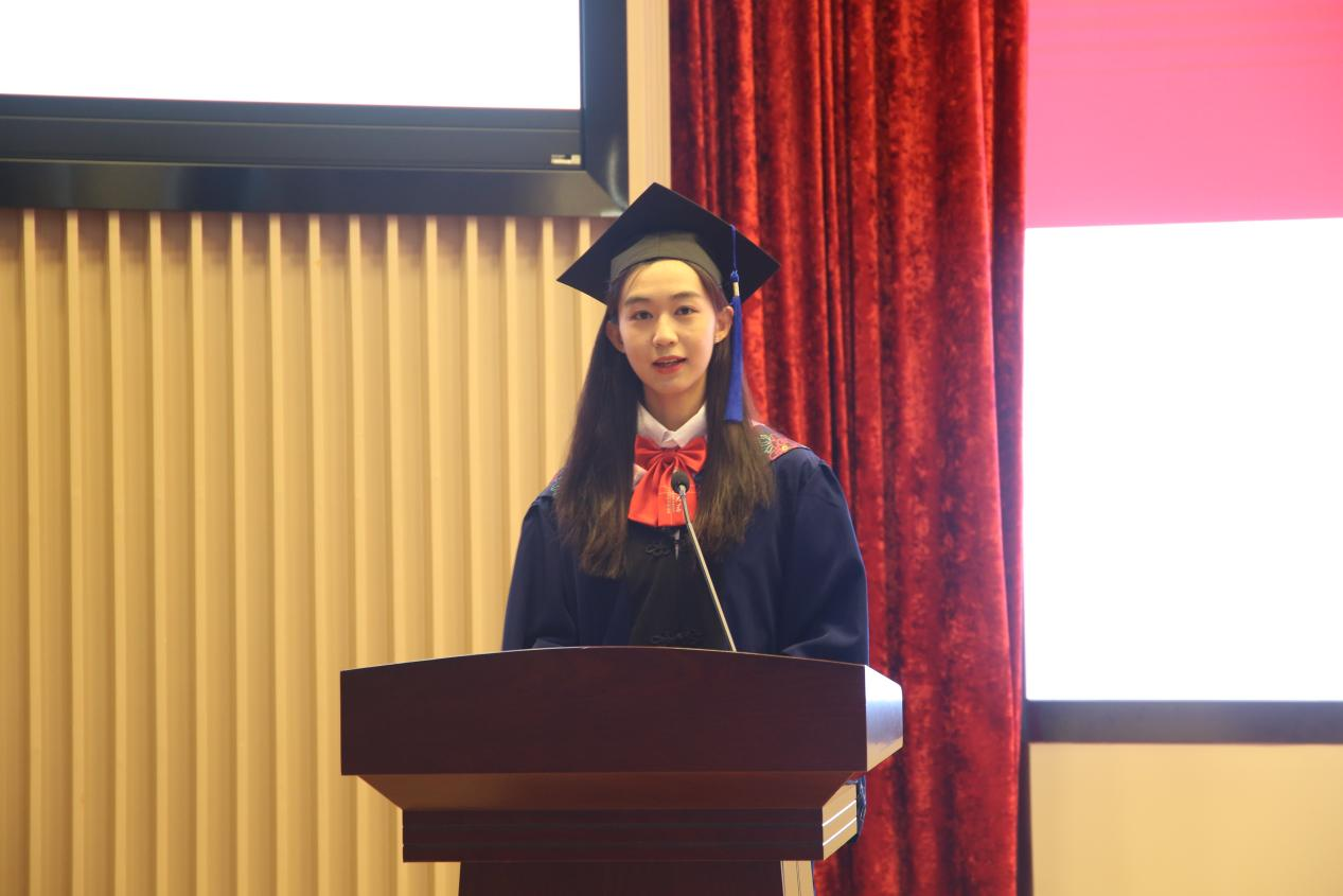 2023届硕士研究生白孟灵作为毕业生代表发言。她以“幸运”为关键词分享了自己的毕业感想,在追忆往昔的过程中表达了对文学的热爱和对老师、朋友、亲人的感激。最后,她借“前程似海”一词祝愿毕业生们拥有宽广的胸怀、开辟广阔的天地,勇敢从容地奔赴人生的下一段旅程。