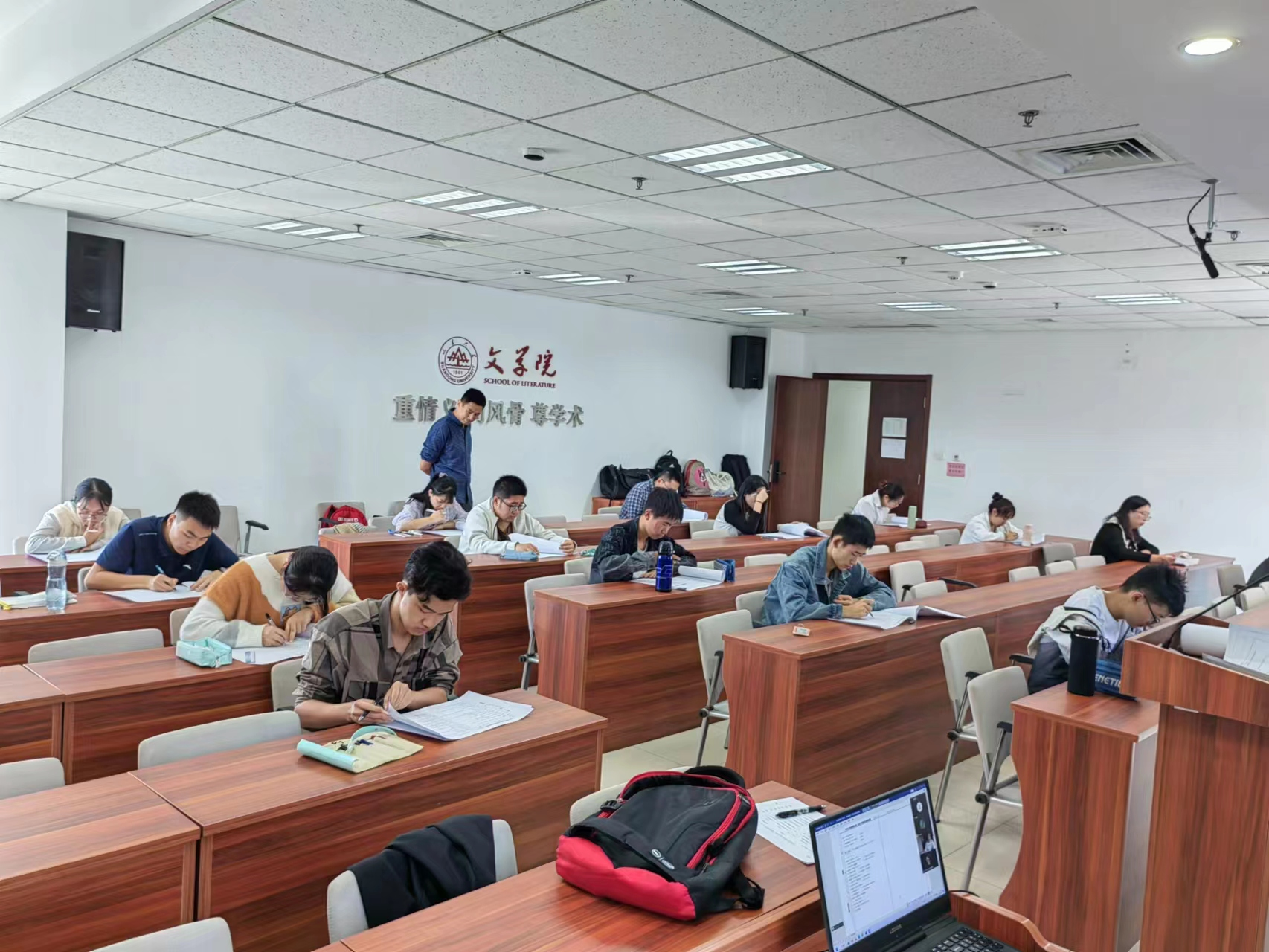 本次校内选拔初试分笔试和面试两部分进行。经过前期宣传和组织,各学院共有18名热爱中华优秀传统文化和古典诗词的同学报名参与本次选拔考试。笔试阶段设置选择、填空题、连线题等题型,综合评估各位考生的古诗词知识储备和灵活处理能力。在面试选拔中,选手们通过抽签决定比赛组合和顺序,进行飞花令、知识抢答、一对一问答等环节。比赛现场井然有序、流畅高效,选手们以积极饱满的精神状态生动诠释了“腹有诗书气自华”的姿态。