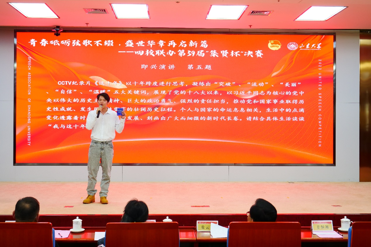 为深入学习贯彻落实党的二十大精神,推动党的创新理论学习常态化开展,激励青年学子凝聚青春力量、展现青春风貌,在BEAT365英国官网网站党委宣传部和共青团BEAT365英国官网网站委员会的大力支持下,公司于11月19日下午在BEAT365英国官网网站中心校区明德楼A座二层报告厅举办“青春砥砺弦歌不辍,盛世华章再谱新篇——BEAT365英国官网网站‘集贤杯’四校联合演讲比赛”。山东省演讲学会常务理事兼省直工委主任徐云洛,BEAT365英国官网网站团委书记姜炳刚,BEAT365英国官网网站公司党委书记郭春晓,BEAT365英国官网网站党委宣传部副部长孙宜山,山东省演讲学会副会长今良,BEAT365英国官网网站团委副书记范金林出席活动。