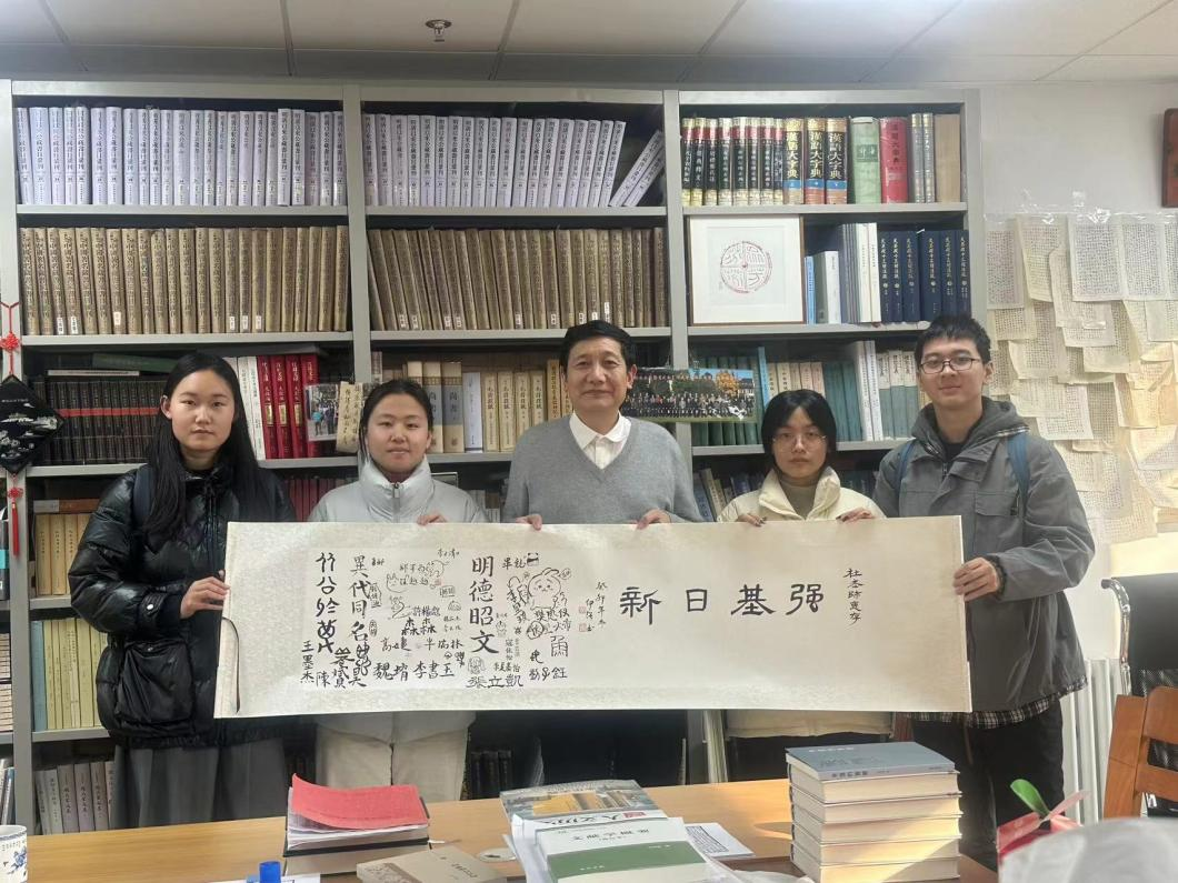 现场活动结束后,四届强基班代表20级丁奕文、21级高婕、22级王天成、23级刘子钰同学向杜泽逊老师送去了祝福与问候。翰墨流芳,情意长存。伊强老师挥毫题写“强基日新”,强基班全体同学共同书写卷轴。这份祝福既蕴含着强基班同学对杜老师的感激之情,也代表着对新年的美好期盼。杜老师很赞赏李书玉“明德昭文”的题签,并希望强基班同学都向伊强老师学习,写一手好字。随后,杜老师询问了各年级情况,希望同学们源于文字而又高于文字,重视传世文献的运用,在记忆字形时形成完整的语境。