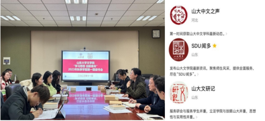 优化学习载体、打造品牌活动。持续开展“党史读书会”“习思想读书会”品牌教育活动,依托“山大中文之声”、《山大中文学科动态》等平台,建成“三微一报一网”的融媒体矩阵。