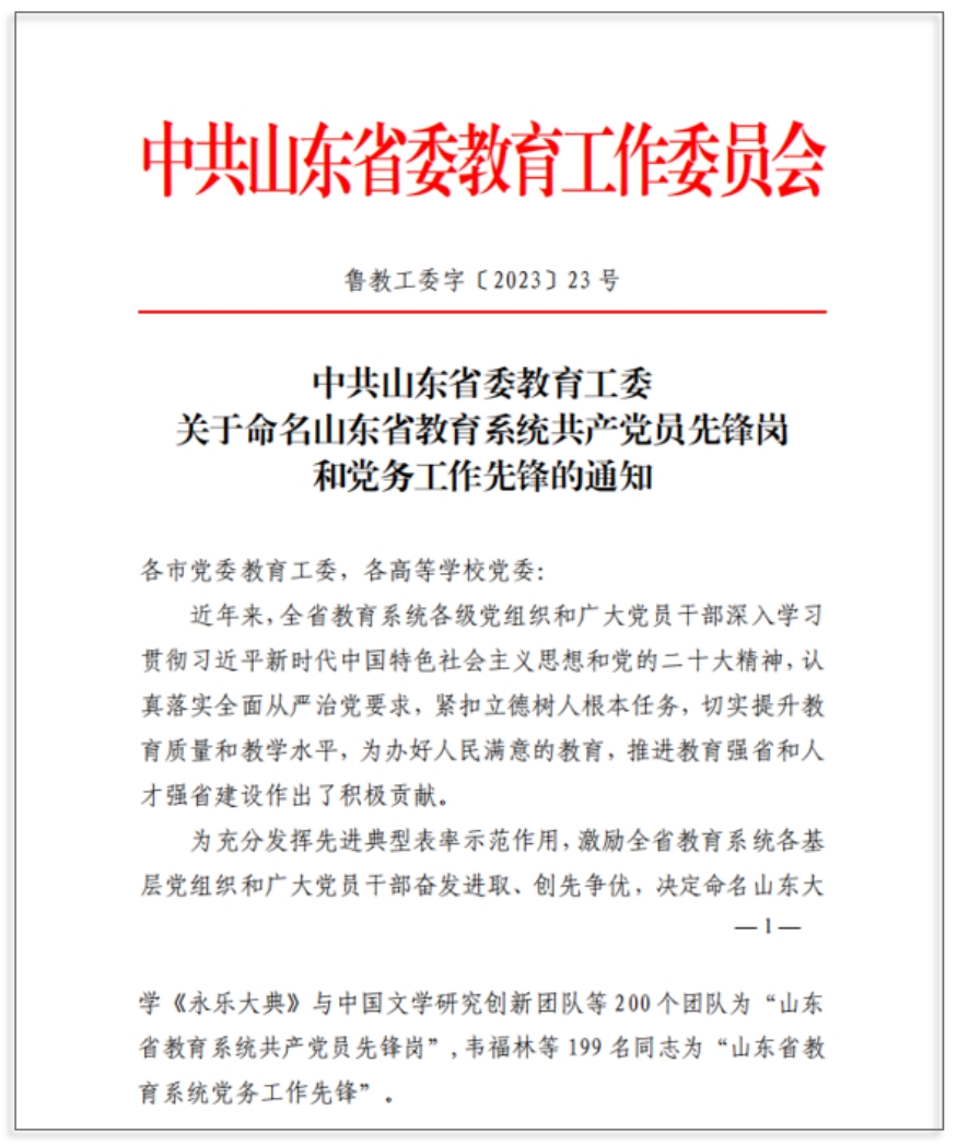 BEAT365英国官网网站《永乐大典》与中国文学创新团队获评“山东省教育系统共产党员先锋岗”。
