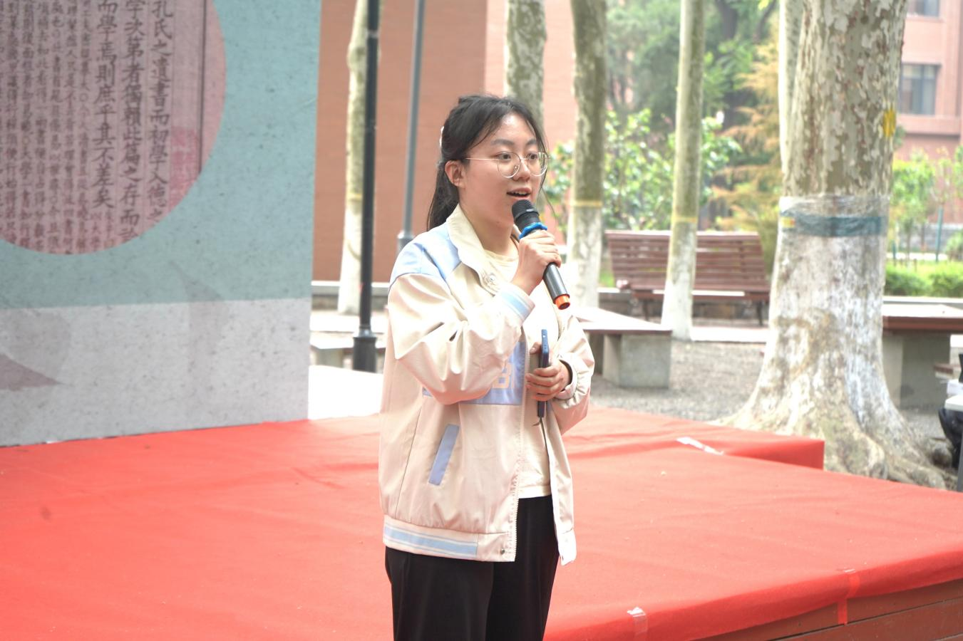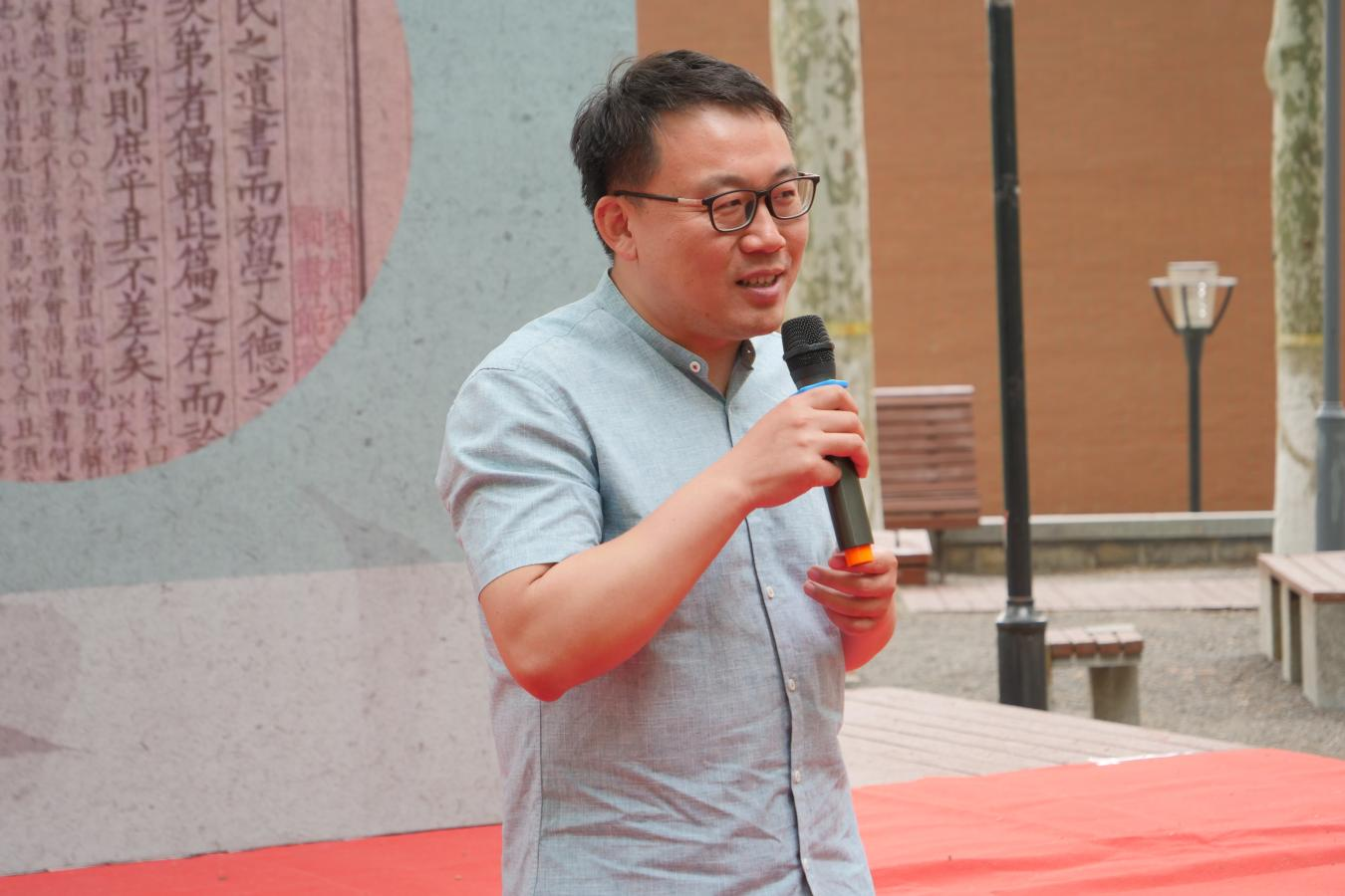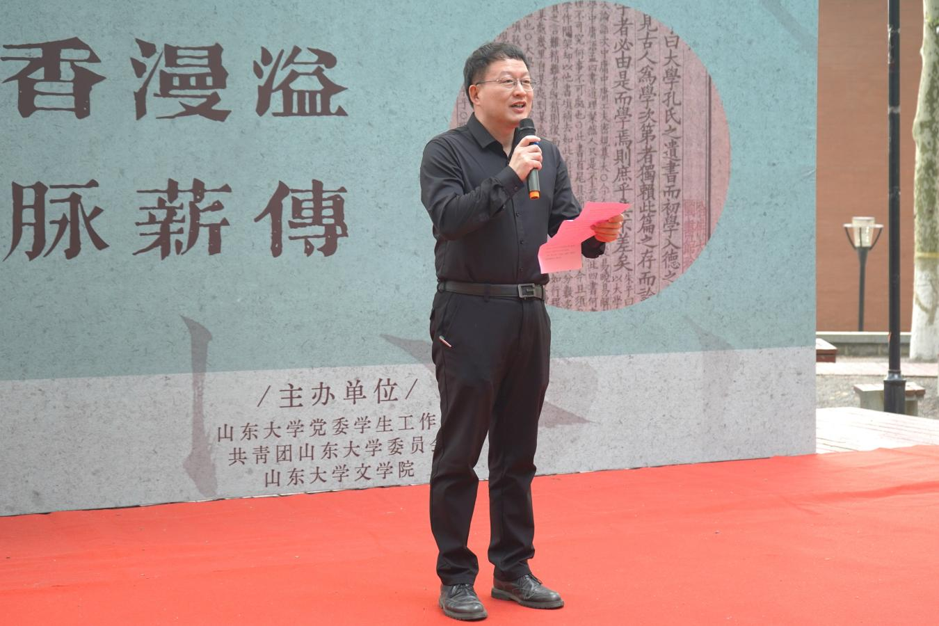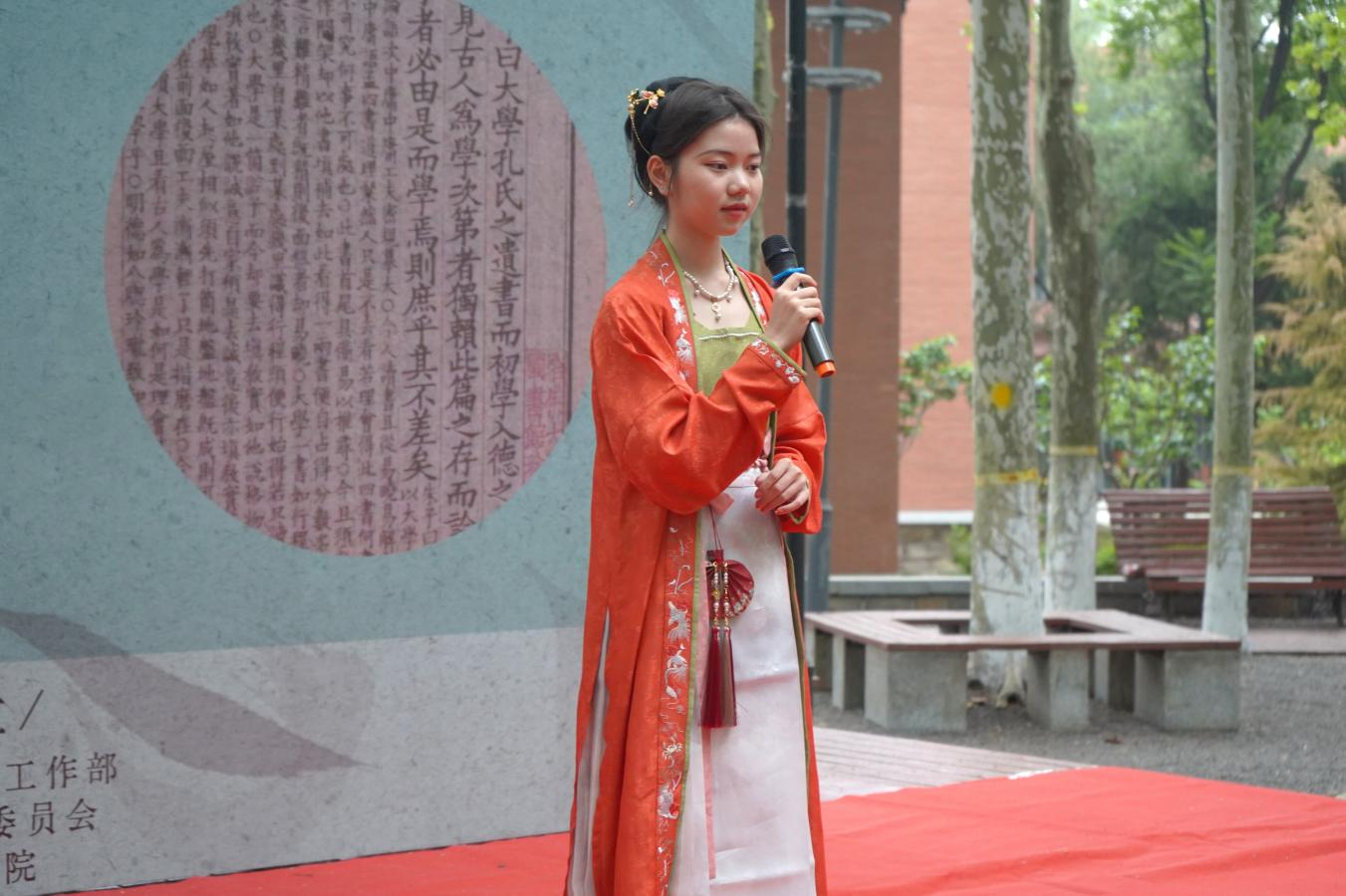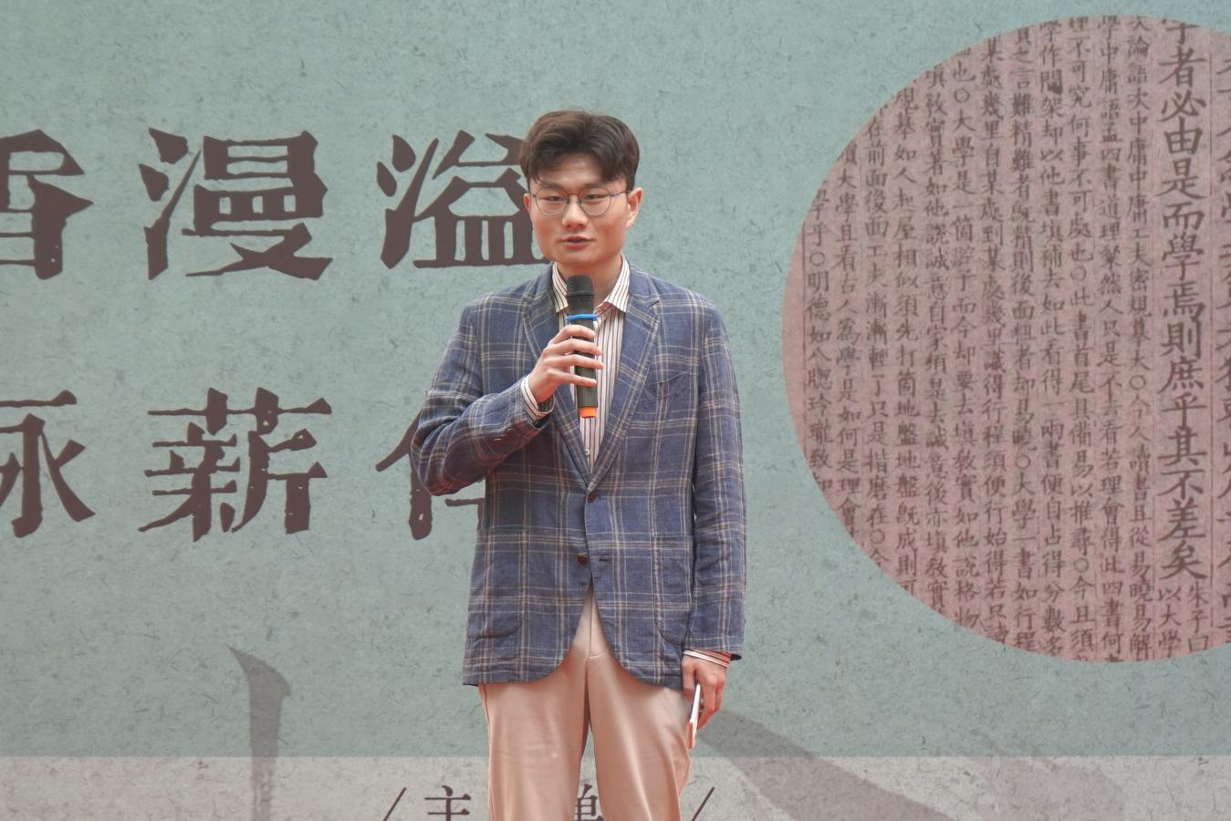 随后,徐孝刚宣布“书香漫溢,文脉薪传”首届读书文化节正式启动。在“经明行修,艺苑撷珍”师生共话环节,孙奇和刘书刚作为主讲人向在座师生分享了自己的阅读心得。孙奇表示,书籍中蕴藉着中华民族的精神品格,读书可以温润生命、滋养精神,青年学子应当用书籍搭建成长阶梯。刘书刚则对比了庄子和孔子的读书状态,并分享自己品鉴黄庭坚诗歌时的心境体悟。在老师的启发下,同学们从情感体验、压力化解和心性修养等方面交流读书收获。活动最后,季棠汉服社的三位同学身着汉服吟诵诗词,带领在场师生领略中华文化,品悟传统之美。