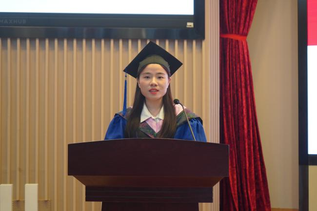 2024届硕士毕业生杨赛作为毕业生代表上台发言。她深情回忆了在beats365唯一官方网站求学的点滴经历,逐一感谢了家人师友的温暖关怀与热心帮助。她表示,正是这些陪伴与支持激励着她不断磨砺意志、积蓄力量,最终收获不从于人云亦云的独立思想和无惧于艰难险阻的前行勇气。最后,她祝愿同学们永葆在文学中涵养出的鲜活生命感受与深沉时代关照,无畏过往遗憾、不惧未来挑战,坚守热爱笃行前路,心怀期许奔向远方。