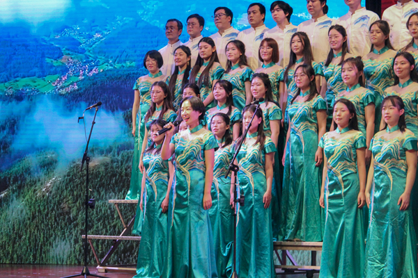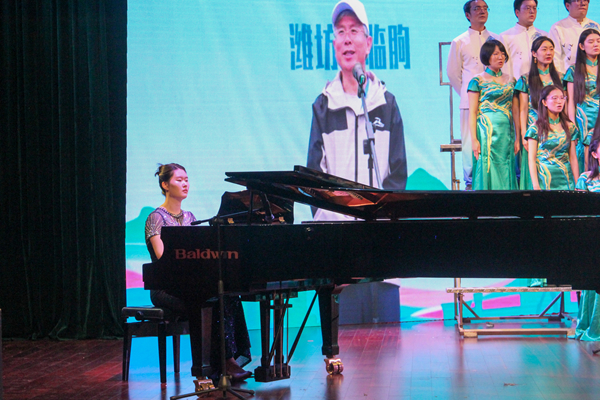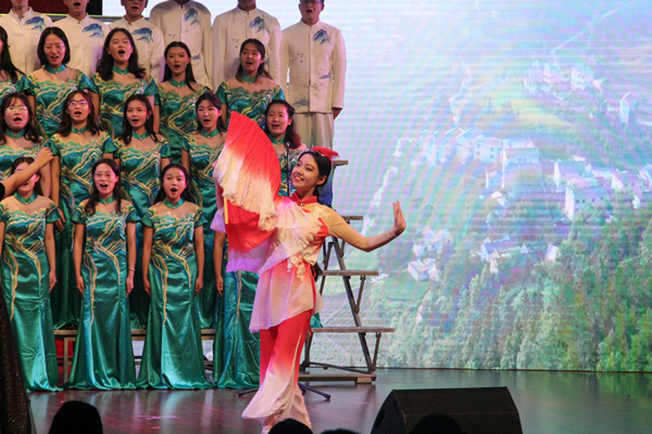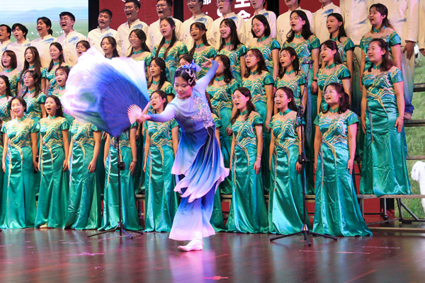 随着歌曲高潮迭起,身着蓝色舞服的陈玉喆和身着红色舞服的刘畅交替起舞,舞步蹁跹,在冷暖色调的交相辉映中,沂蒙山水的清秀画卷和新时代的美好生活图景仿佛在观众面前徐徐展开。在演唱过程中,四个声部默契配合,主调恢弘,和声如织,将“军民水乳交融、生死与共”的沂蒙革命精神娓娓道来,铿锵有力地唱出了对祖国锦绣河山的深情赞美。随着一句“沂蒙山的人民啊喜洋洋”,演唱落下帷幕,合唱团收获了现场观众雷鸣般的掌声。