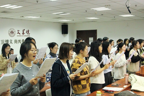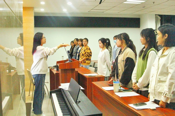 舞台上短暂几分钟的精彩演唱,凝聚的却是师生们长久的努力和辛勤的汗水。在一个月紧锣密鼓的筹备过程中,合唱团成员利用课余时间先后排练十余次,从熟悉歌曲到音准、节奏的仔细推敲,从舞台设计到各声部之间的反复磨合,正是台前幕后点点滴滴的努力为本次比赛的优异成绩奠定了坚实的基础。在歌曲的选择以及整体表演的构思上,公司合唱团紧紧围绕“导学思政”这一核心主题,在一遍遍精心打磨中为《新编沂蒙山小调》赋予全新的生命力。