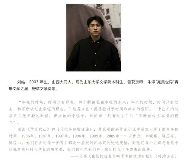 刘皓一直对写作怀有赤诚之心,他勤于阅读,善于沉思,也勇于将思考付诸笔端。通过不懈实践,近三年间,他的文学之旅越走越开阔。在登上《当代》这一重要刊物之前,他已在《时代文学》《名作欣赏》等刊物上发表了多篇小说与评论,并曾荣获殊第三届“京师—牛津‘完美世界’青年文学之星”的殊荣。刘皓的文学成就,也体现了学院在创意写作人才培养方面措施得力。随着作家书院的成立,山大文院这方文学沃土无疑将为刘皓等有志于文学创作的青年才俊提供更加广阔的舞台与更深厚的滋养。