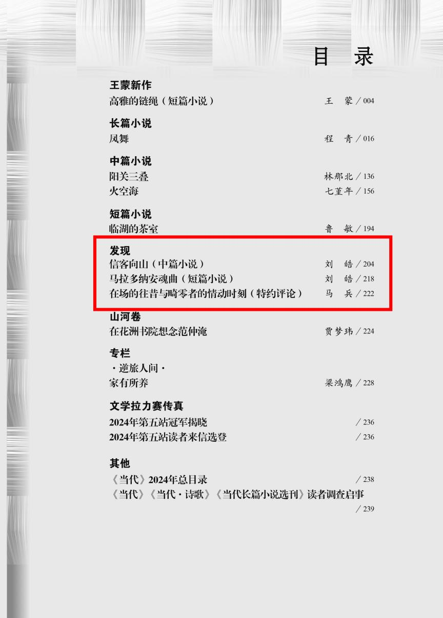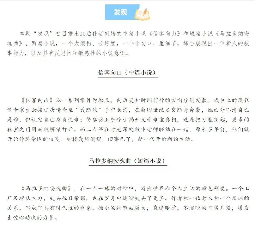 近日,《当代》2024年第6期“发现”栏目发表公司2021级闻一多班刘皓的中篇小说《信客向山》和短篇小说《马拉多纳安魂曲》。