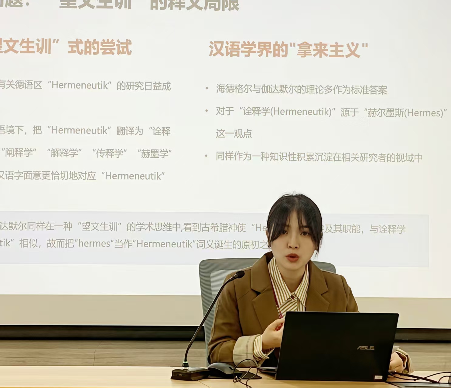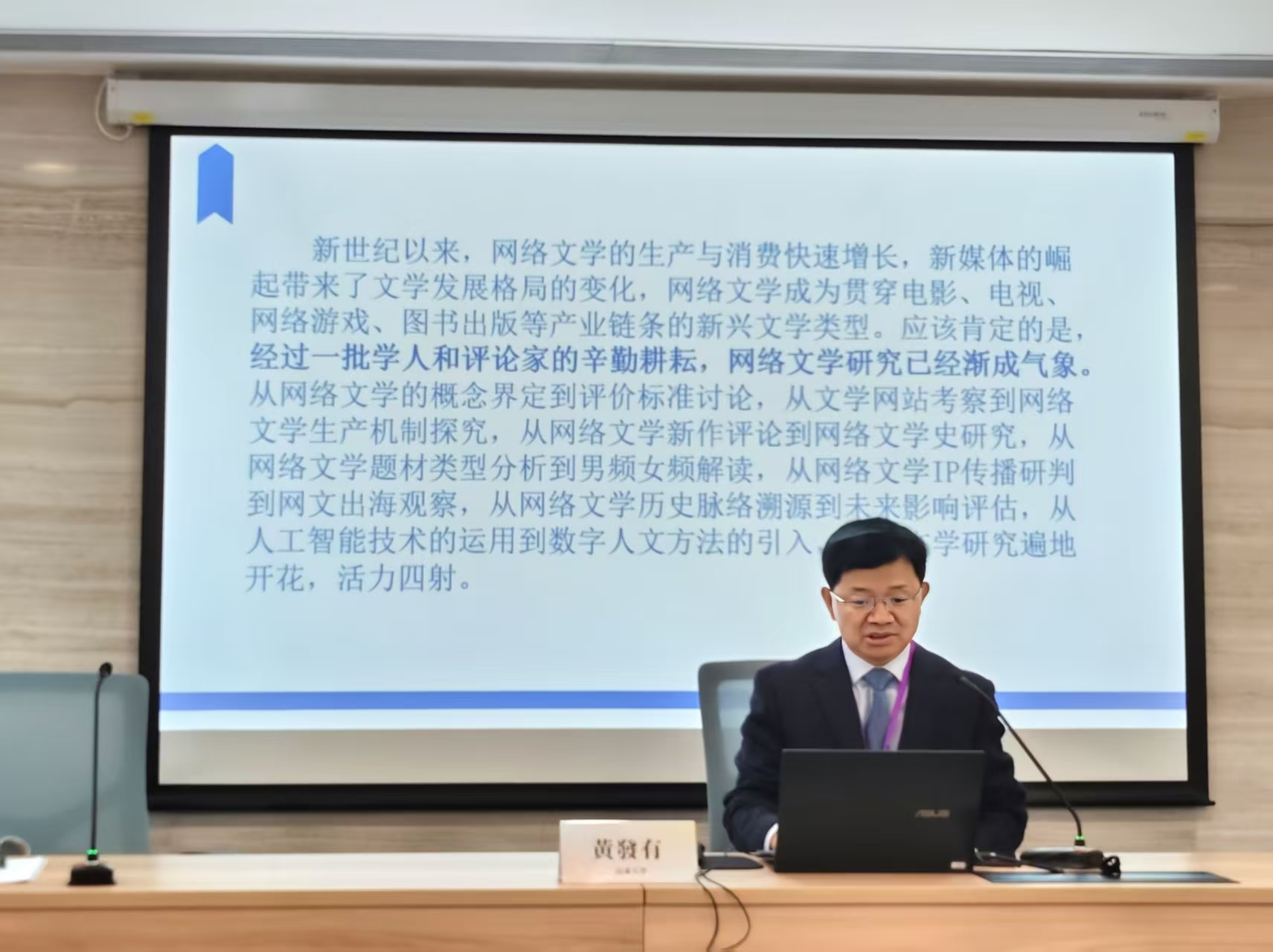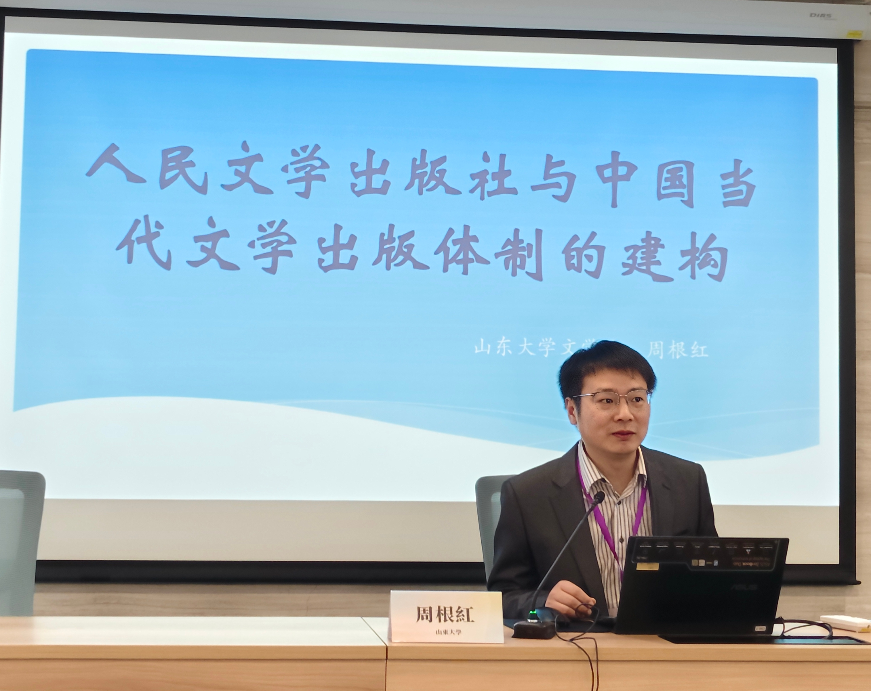 大会发言环节在冯景禧楼220室进行。黄发有经理向与会师生深刻且全面地分析了当代网络文学研究的进展与问题;杨建刚副经理系统阐释了中国现代审美启蒙的两条路径及其转换的内在逻辑;王涵老师发表了题为“诠释学源于赫尔墨斯吗?——文明互鉴与跨文化视域下‘Hermeneutik’语源新考”的精彩发言;李剑锋教授就“嵇康的史学修养与高士传写作”话题进行了详尽的说明;孙学堂教授通过精辟的阐发,探讨了“王尚䌹与明代复古思潮”这一论题;周根红教授则以“人民文学出版社与中国当代文学出版体制的建构”为题作了深入浅出的讲解。