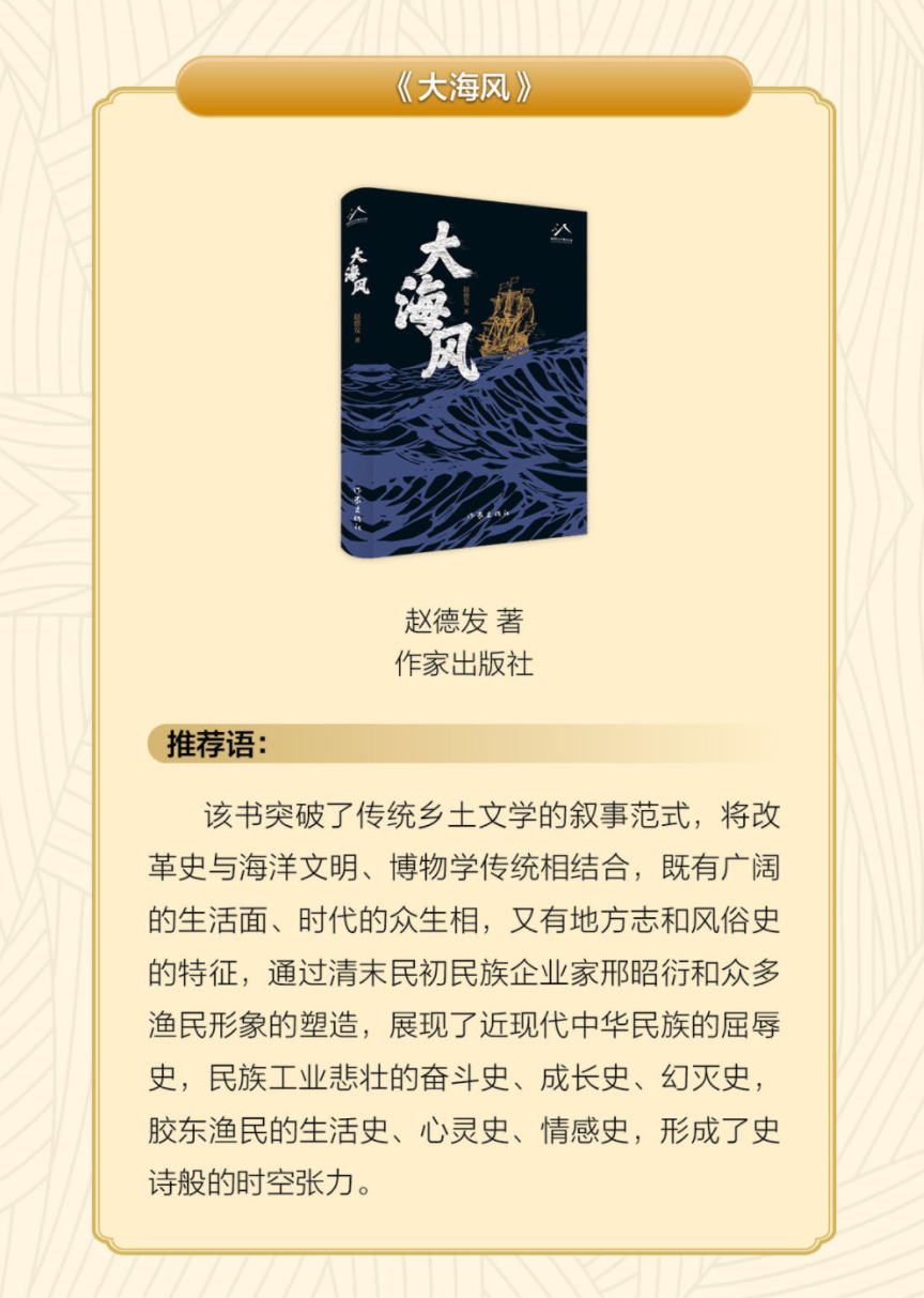 此次入选的“新华荐书”,是新华社打造的国家级公益文化品牌,由权威机构指导、专家严格评审,入选图书均为思想精深、艺术精湛的时代精品,是国内最具公信力的图书榜单之一。《大海风》入选其中,既是对赵德发教授潜心文学创作、以匠心铸精品、以笔墨传精神的杰出艺术成就的高度肯定,更是公司始终秉持人文初心、重视创作实践、培育文学力量的成果具象化体现。