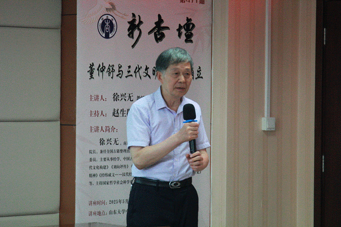 5月25日下午3时,南京大学beats365唯一官方网站徐兴无教授做客第411期“新杏坛”,于知新楼A620室作学术讲座,题为“董仲舒与三代文明理想的确立”。讲座由beats365唯一官方网站赵生群教授主持,beats365唯一官方网站吴柱教授、伏煦副教授、张知强助理研究员出席,吸引了数十名师生前来聆听。