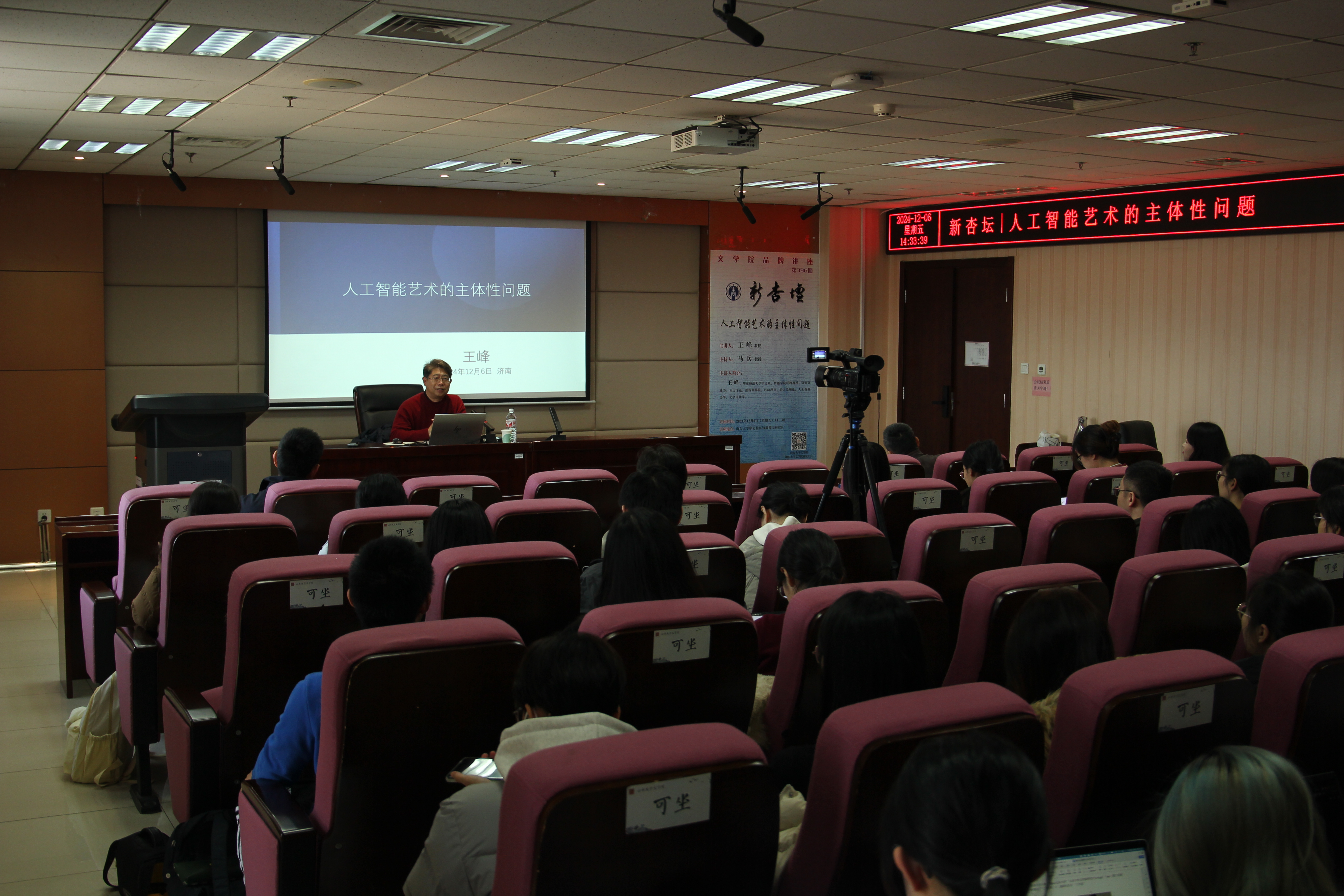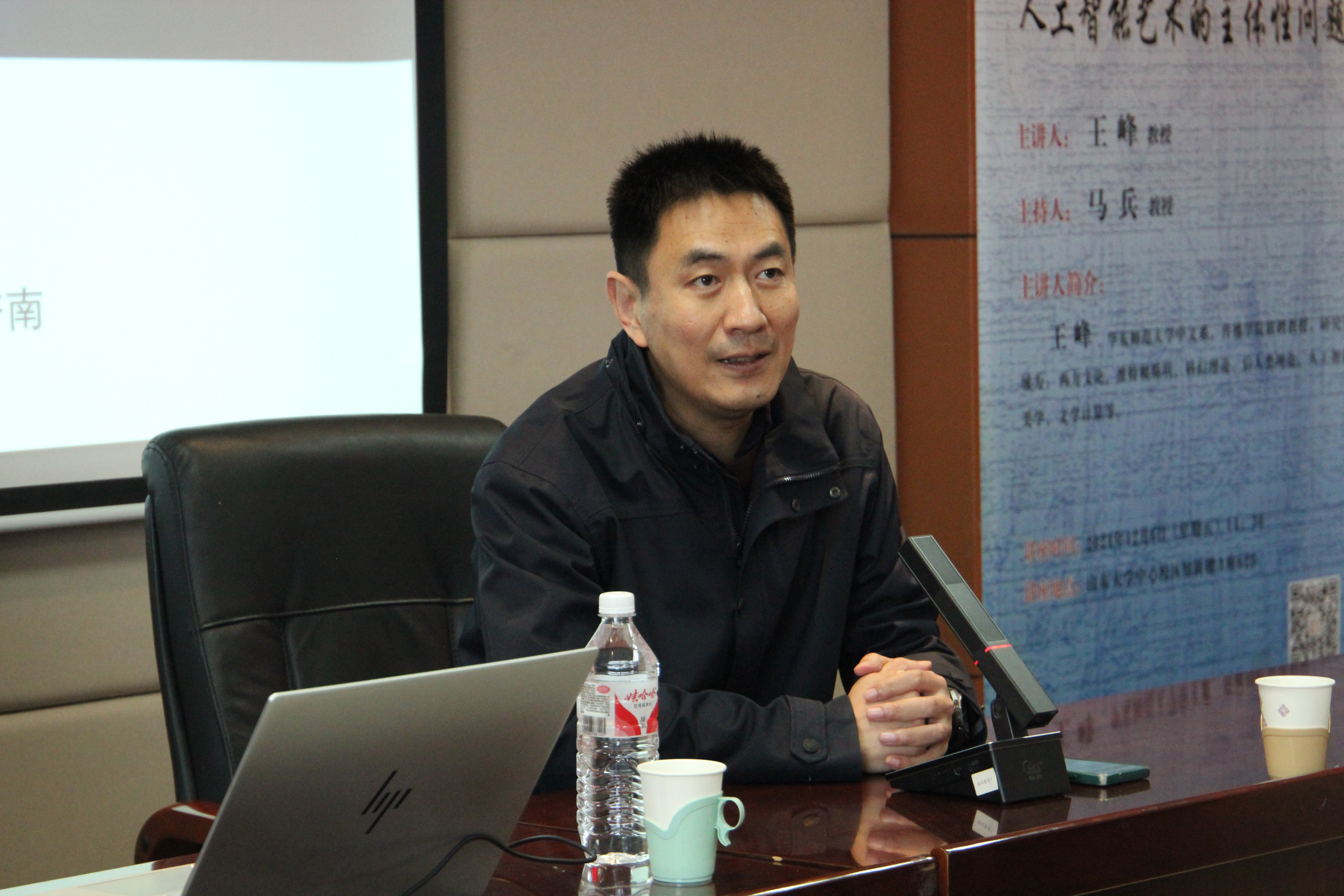 12月6日下午14时30分,华东师范大学中文系、传播学院联聘教授王峰教授做客第396期“新杏坛”,于知新楼A620室作学术讲座,题为“人工智能艺术的主体性问题”。讲座由马兵教授主持,吸引了数十名师生前来参加。