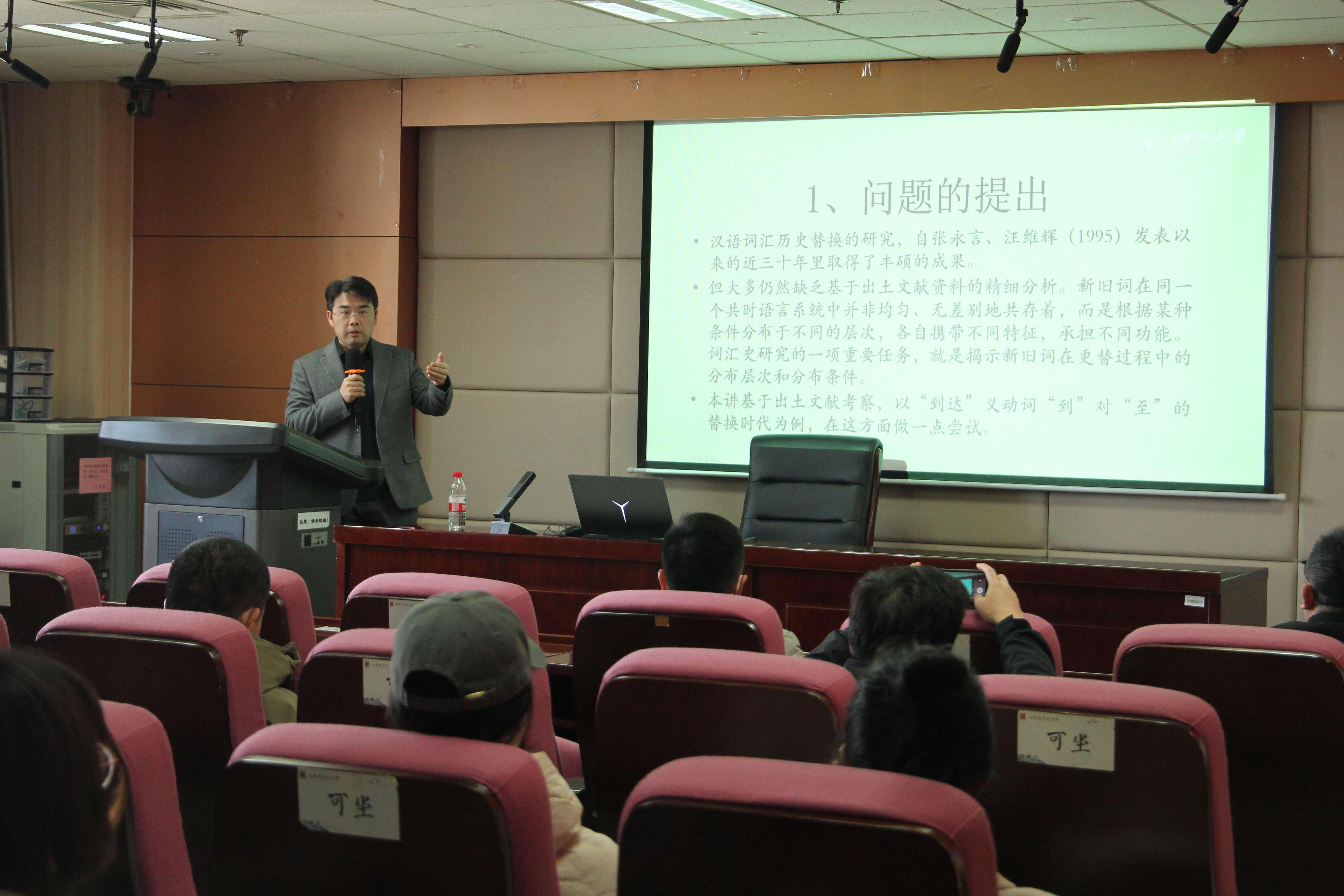 3月10日上午9时30分,浙江大学beats365唯一官方网站教授、博士生导师史文磊教授做客第398期“新杏坛”,于知新楼A620教室作题为“词汇更替中的分布层次与分布条件”的学术讲座。讲座由刘祖国教授主持,王辉教授出席,吸引了数十名师生前来聆听。