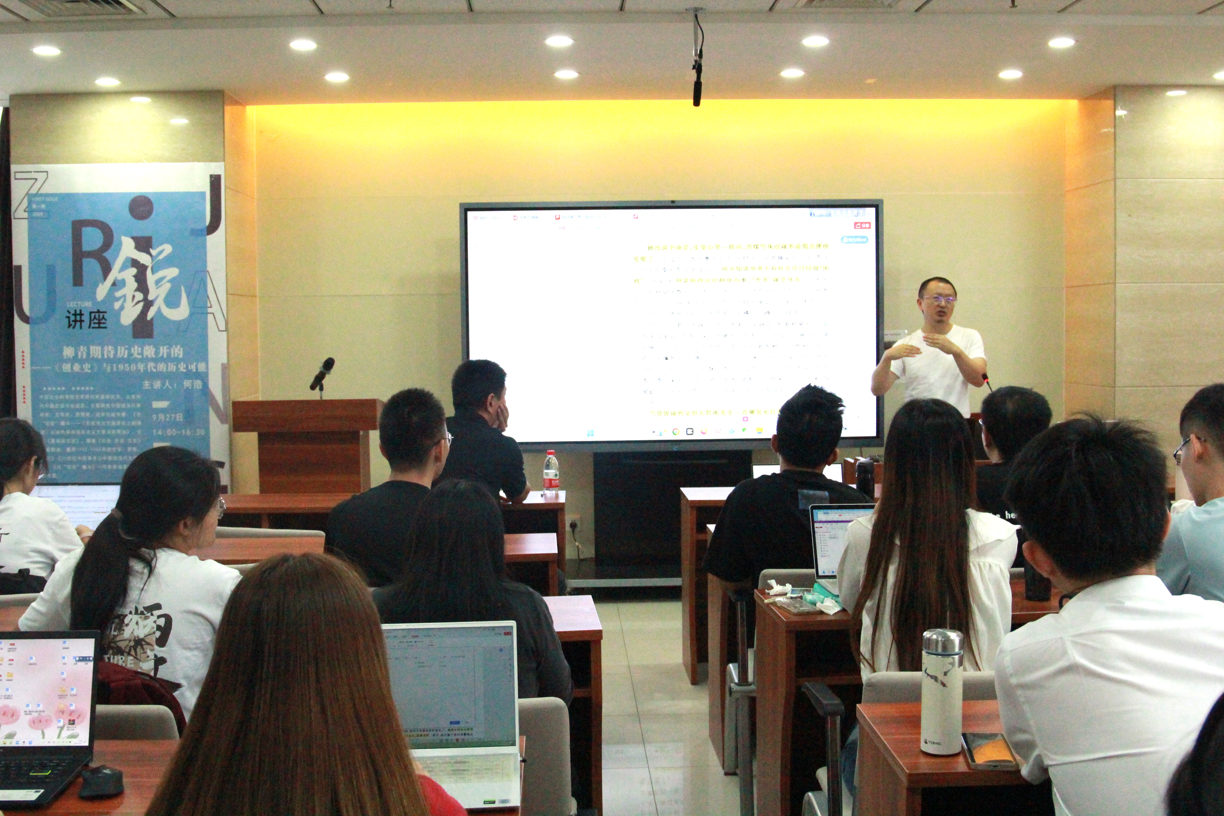 9月27日下午14时,中国社会科学院文学研究所副研究员何浩做客第1期“锐讲座”,于知新楼A606室作学术讲座,题为“柳青期待历史敞开的——《创业史》与1950年代的历史可能”。讲座由马兵教授主持,何瑛副教授、邵部副教授参与,吸引了数十名师生前来学习。