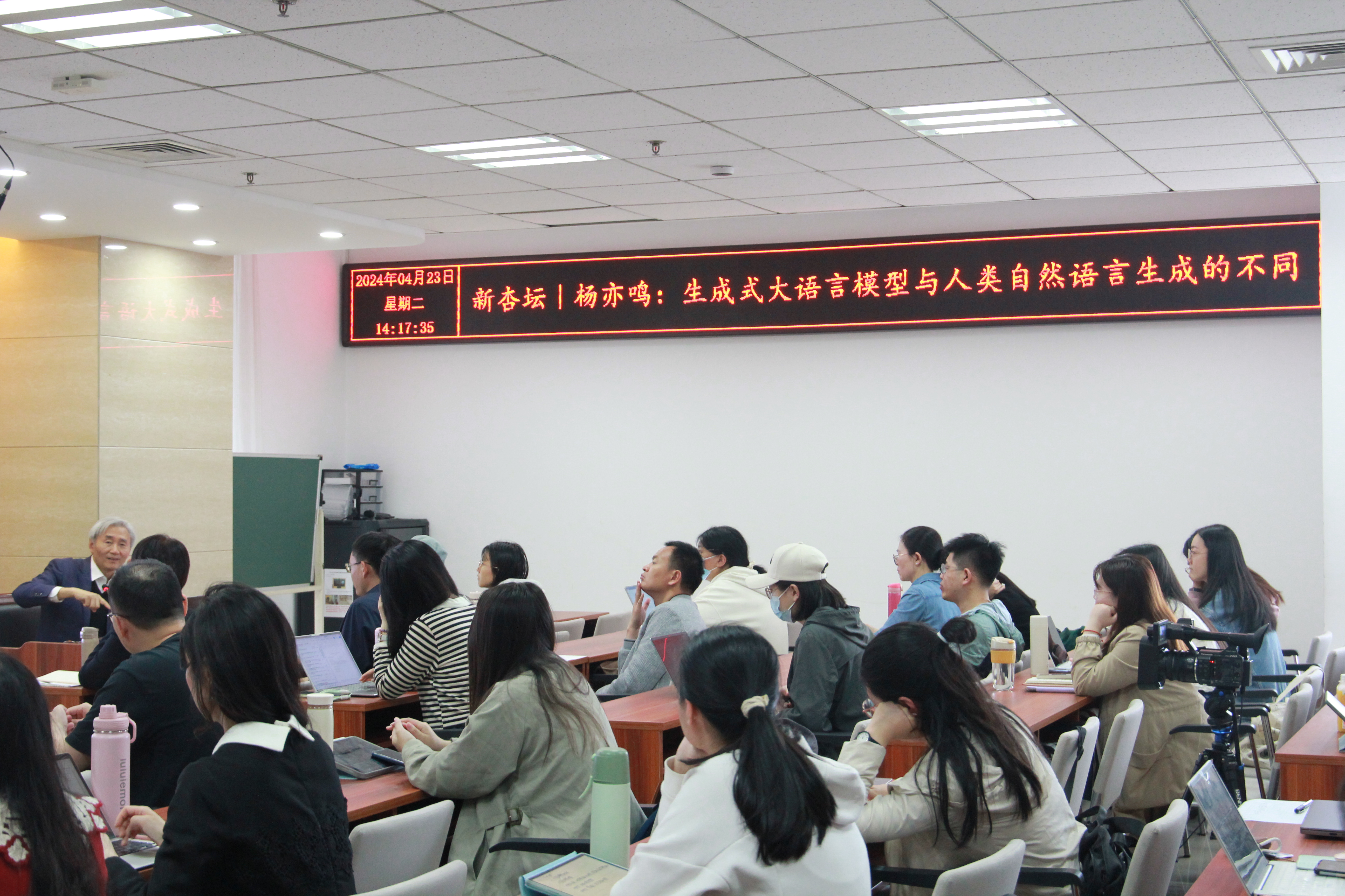 4月23日14时,江苏师范大学语言科学与艺术学院教授杨亦鸣做客第367期“新杏坛”,于知新楼A606室作题为“生成式大语言模型与人类自然语言生成的不同”的学术讲座。讲座由岳立静教授主持,王辉教授、寇鑫教授、刘文副教授、张燕芬副教授等出席,吸引了近百名师生前来聆听。