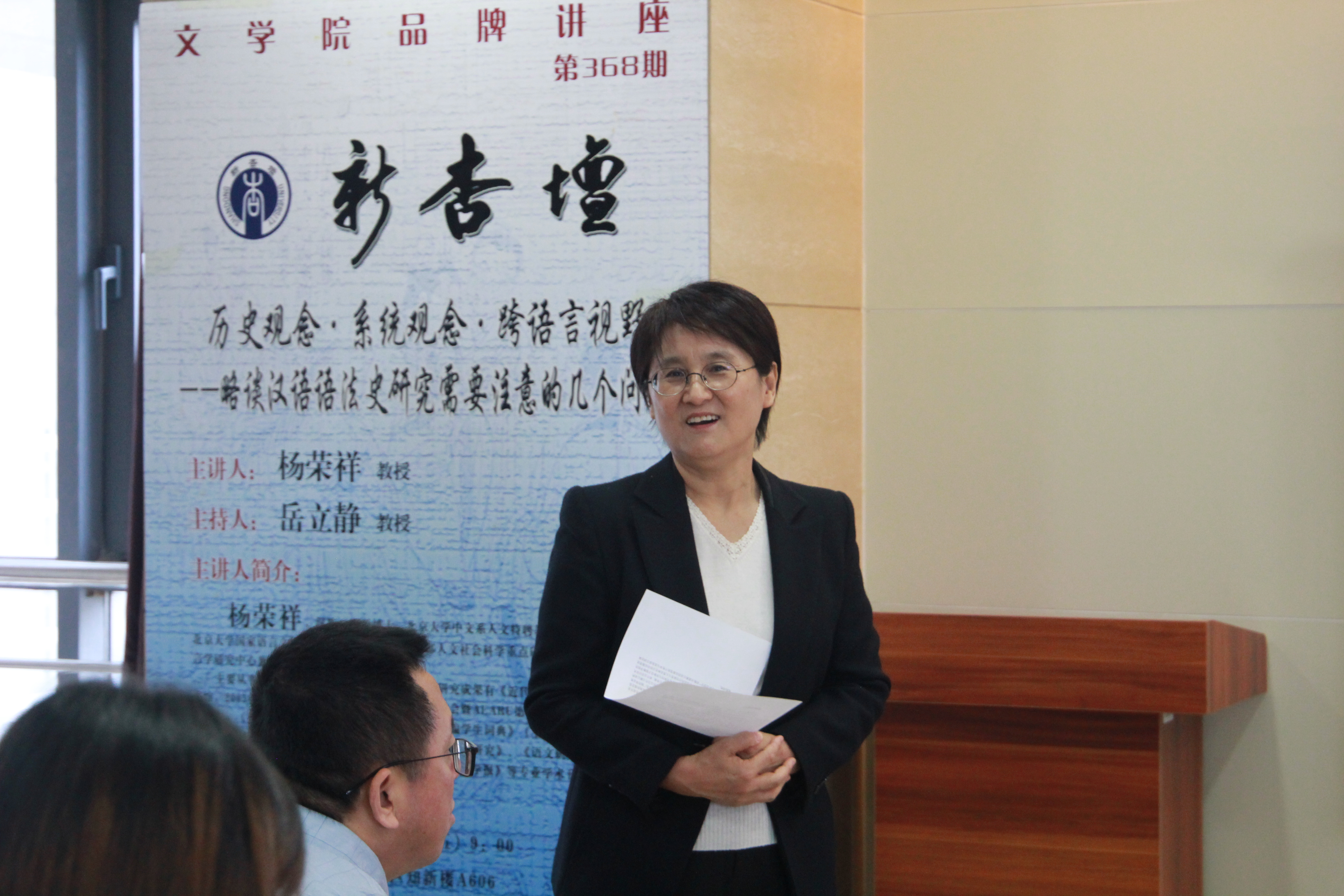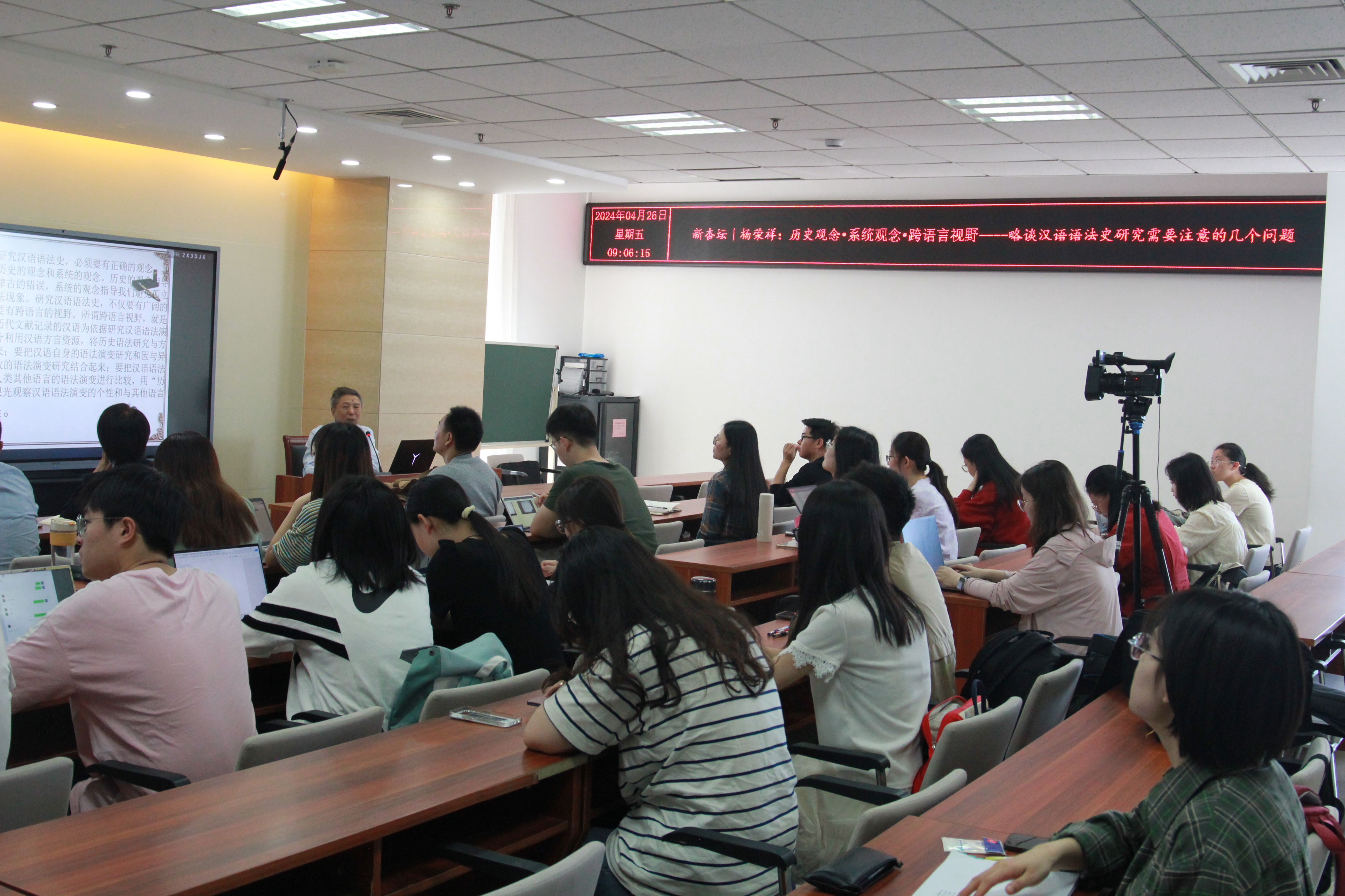 2024年4月26日9时,北京大学中文系教授杨荣祥做客第368期“新杏坛”,于知新楼A606室作题为“历史观念·系统观念·跨语言视野——略谈汉语语法史研究需要注意的几个问题”的学术讲座。讲座由岳立静教授主持,刘祖国教授、王辉教授、寇鑫教授、刘文副教授等出席,吸引众多同学前来聆听。