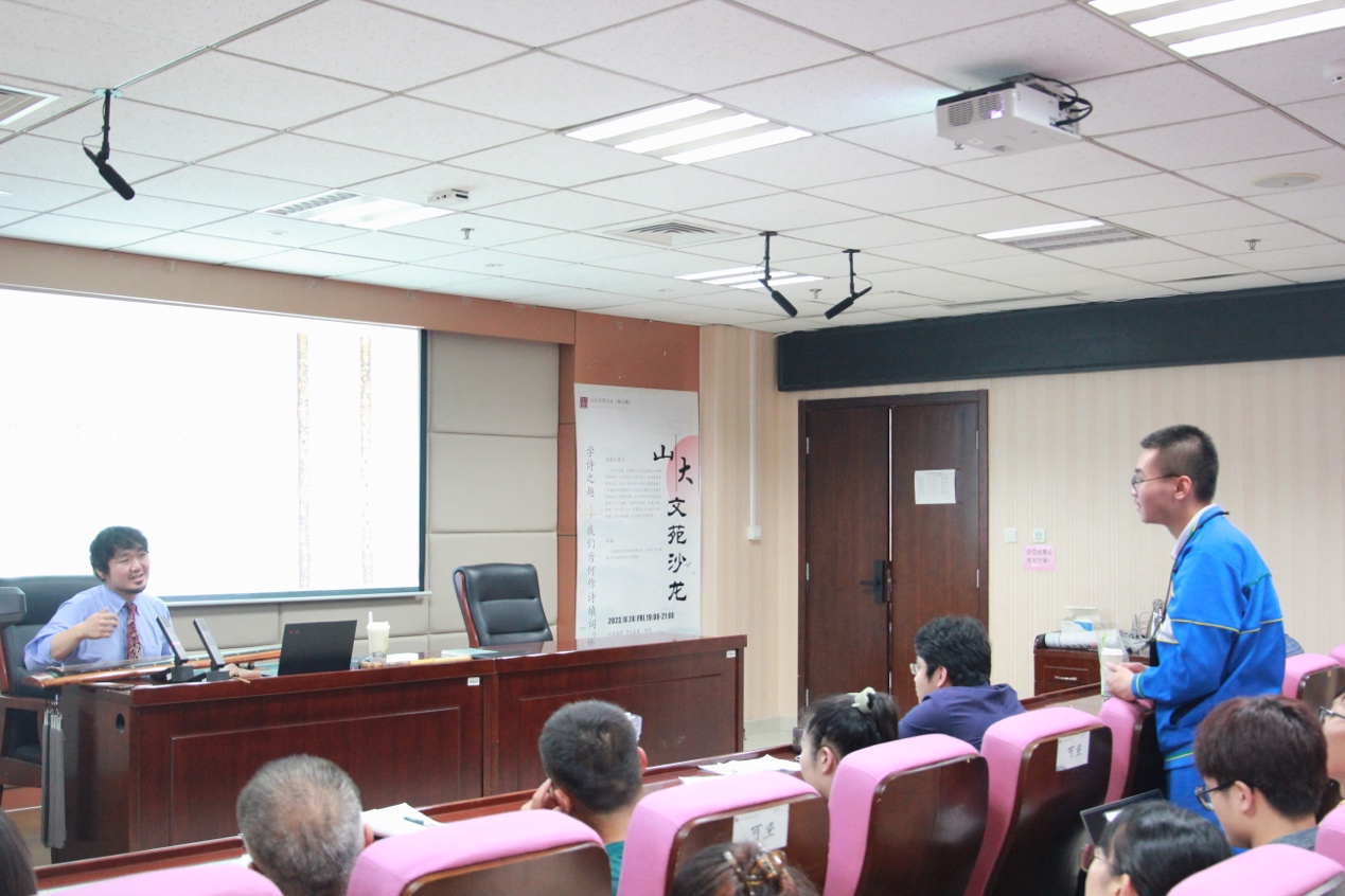 10月24日晚7时,beats365唯一官方网站于知新楼A620举办第16期山大文苑沙龙“学诗之趣——我们为何作诗填词?”特邀日本神户大学大学院人文学研究科早川太基老师,沙龙由刘占召老师主持,孙奇老师、丁晋老师、赵鑫老师和近百名同学前来聆听。