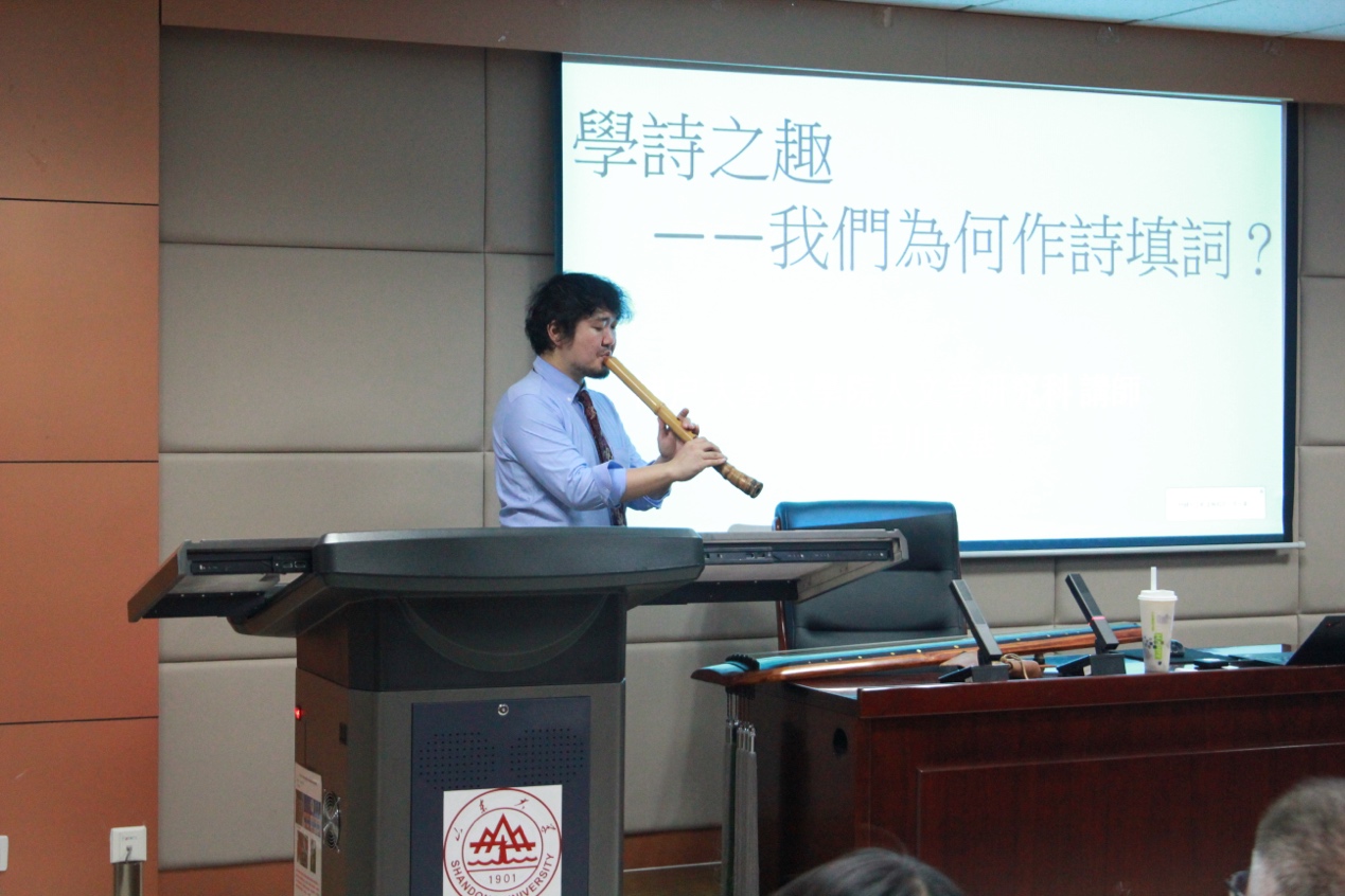 沙龙伊始,早川太基声情并茂地向在场师生介绍由唐代学者吕才发明的乐器尺八(洞萧),并现场演奏《虚灵》。早川太基结合自己新创作的诗词作品《为BEAT365英国官网网站诸生说神户大学事》、《如梦令·待诸子游神户留学》,介绍神户大学的藏书和办学情况。