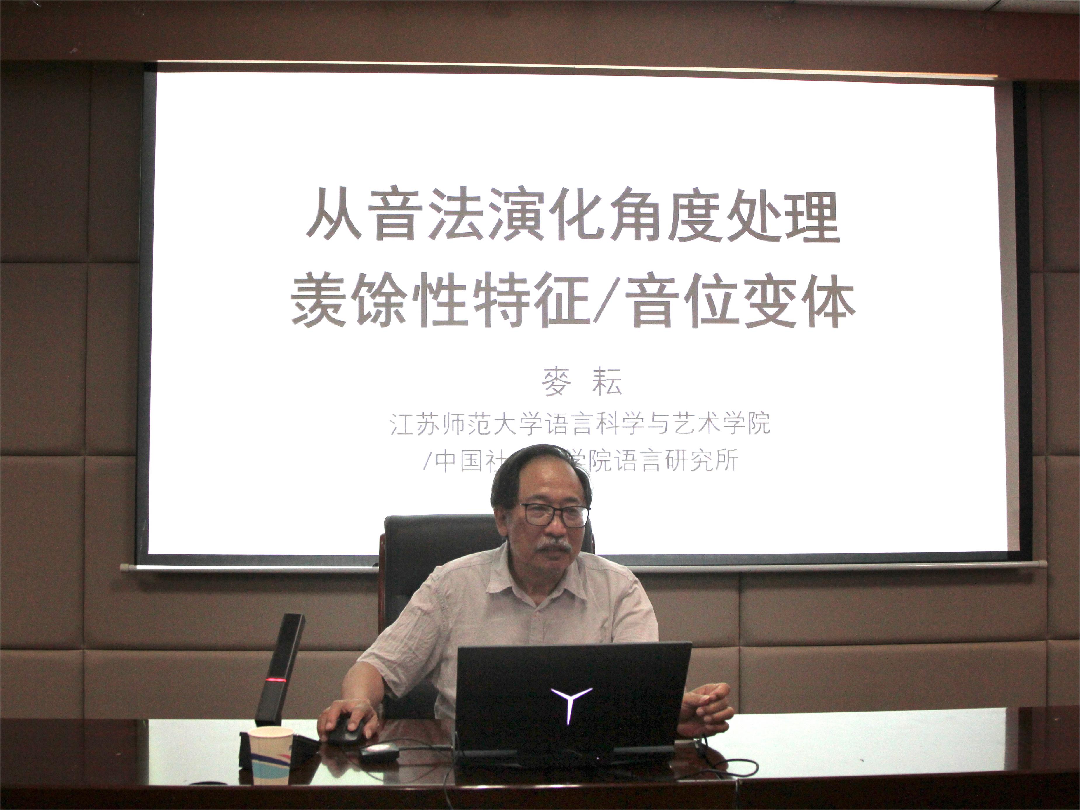 2023年6月3日晚7时30分,中国社科院语言研究所研究员、《方言》杂志原主编、江苏师范大学语言科学与艺术学院特聘教授麦耘先生于知新楼A620室作题为“从音法演化角度处理羡余特征/音位变体”的学术讲座。本次讲座由公司张树铮教授主持,公司岳立静教授、刘娟副教授,外国语学院时秀娟教授及三十余名硕博士研究生及博士后参加。