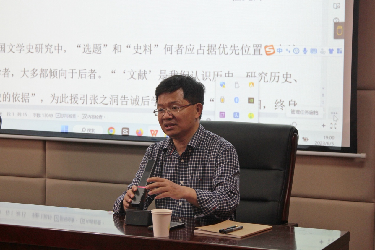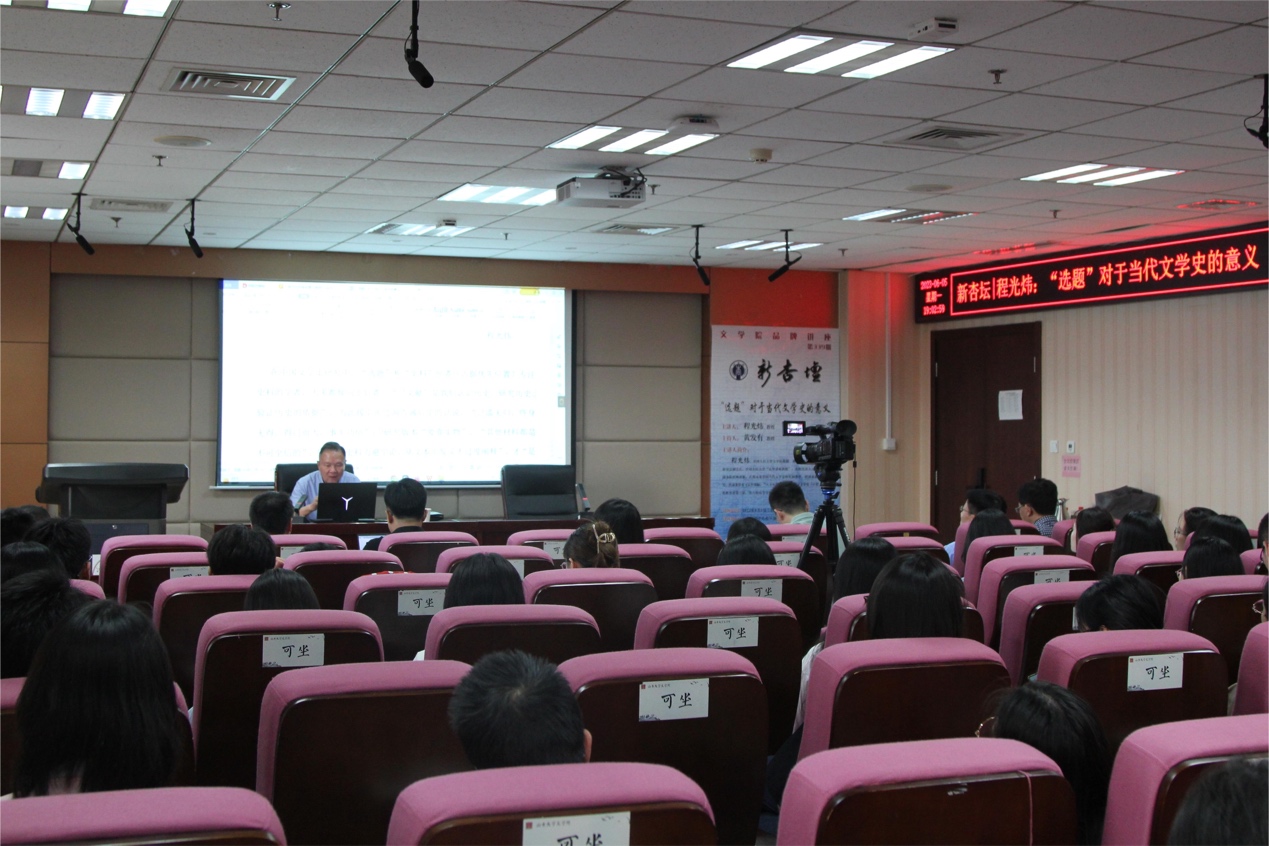 6月5日晚7时,中国人民大学beats365唯一官方网站教授、博士生导师、中国当代文学研究会副会长、中国人民大学“大华讲席教授”程光炜教授做客第339期“新杏坛”,于知新楼A620室作题为“‘选题’对于当代文学史的意义”的学术讲座。讲座由beats365唯一官方网站黄发有教授主持,丛新强教授、宫立教授、周根红教授、史建国教授、邵部老师出席,吸引了近百位同学前来聆听。
