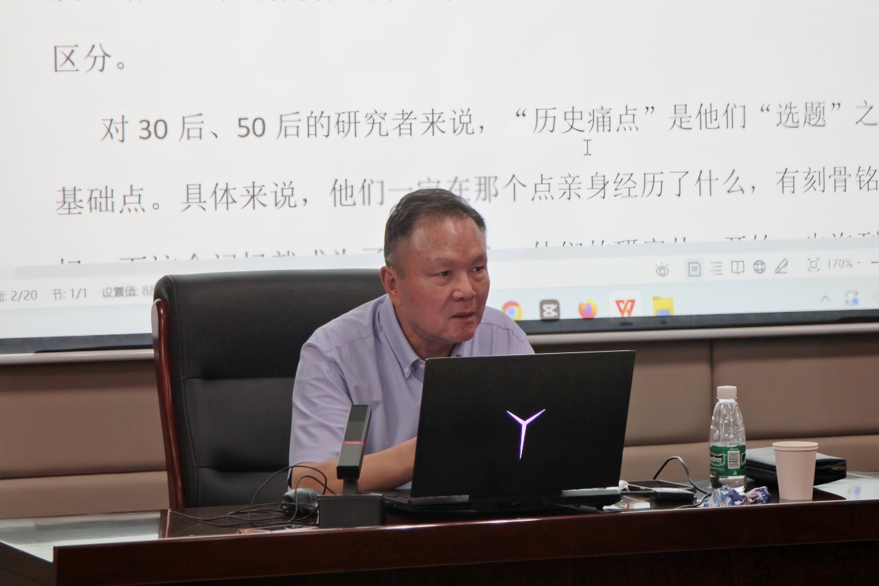 引入部分过后,程光炜提出文学史研究首先应“建立一个基地”,他认为“专史是通向通史的必要途径”,通史建立在专史的训练和积累之上,同学们做文学史研究应先从具体的问题做起。此外,中国当代文学史的研究不能脱离中国国情。他讲到,对30后、50后的研究者来说,历史痛点是其选题之发生的基础点,即他们在某个时间点上有刻骨铭心的记忆,这个记忆就成为一个中心,他们的研究从始至终都会围绕着这个中心反复的徘徊和循环,此历史痛点便成为这些研究者的“基地”。以洪子诚老师及其作品为例,他进一步说明、分析了这种观点,并指出文学史家应有历史素养。