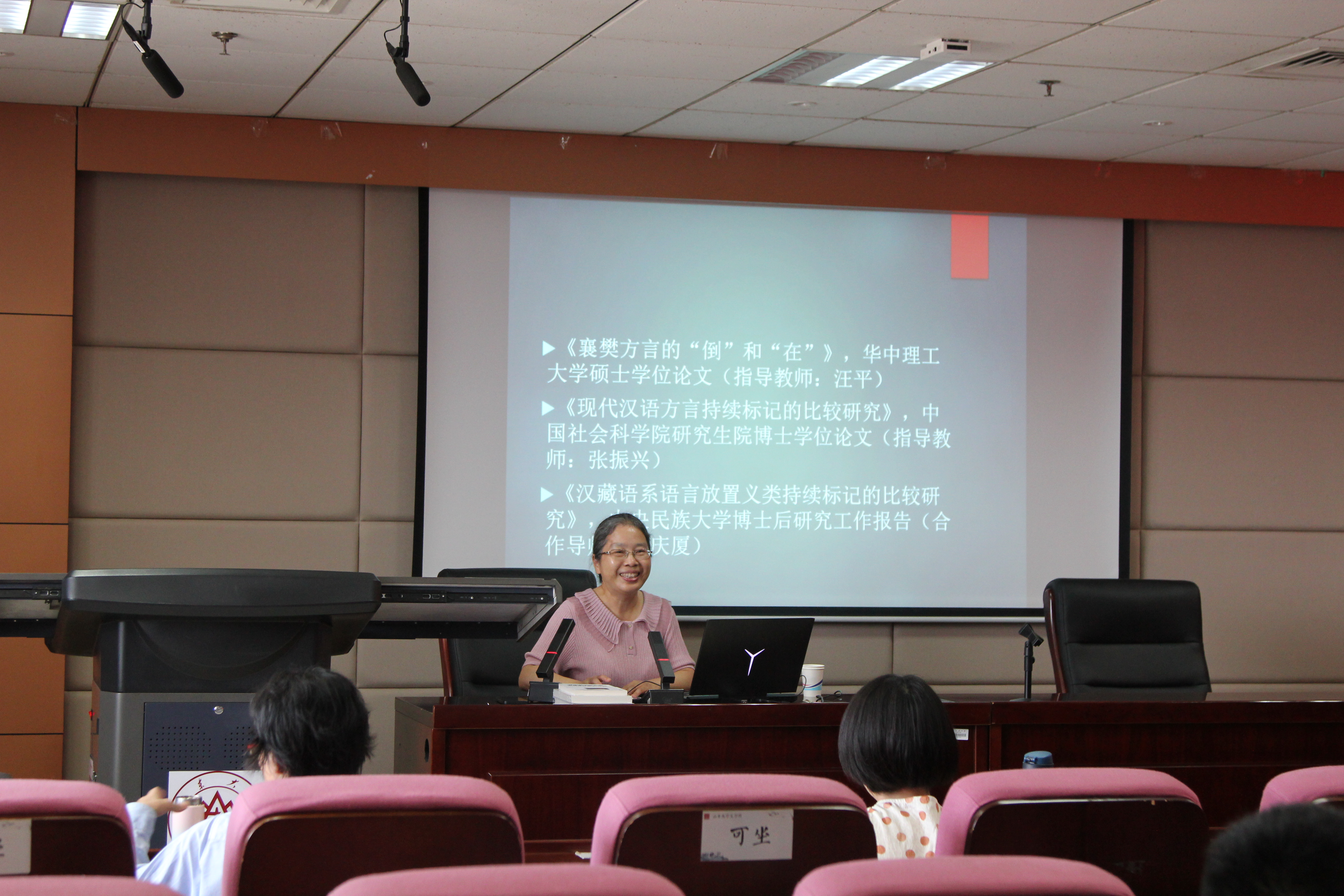 首先,罗自群教授介绍了自身求学经历和不同时期的研究兴趣。她提到,自己的学术研究之路经历了从以普通话推广为主要工作到对汉语方言产生兴趣,再到以少数民族语言研究为重点。基于自己的经历,她鼓励在场同学广泛搜集文献,拓宽学术视野,不拘泥于一点,由点到面地逐步深化自己的研究。