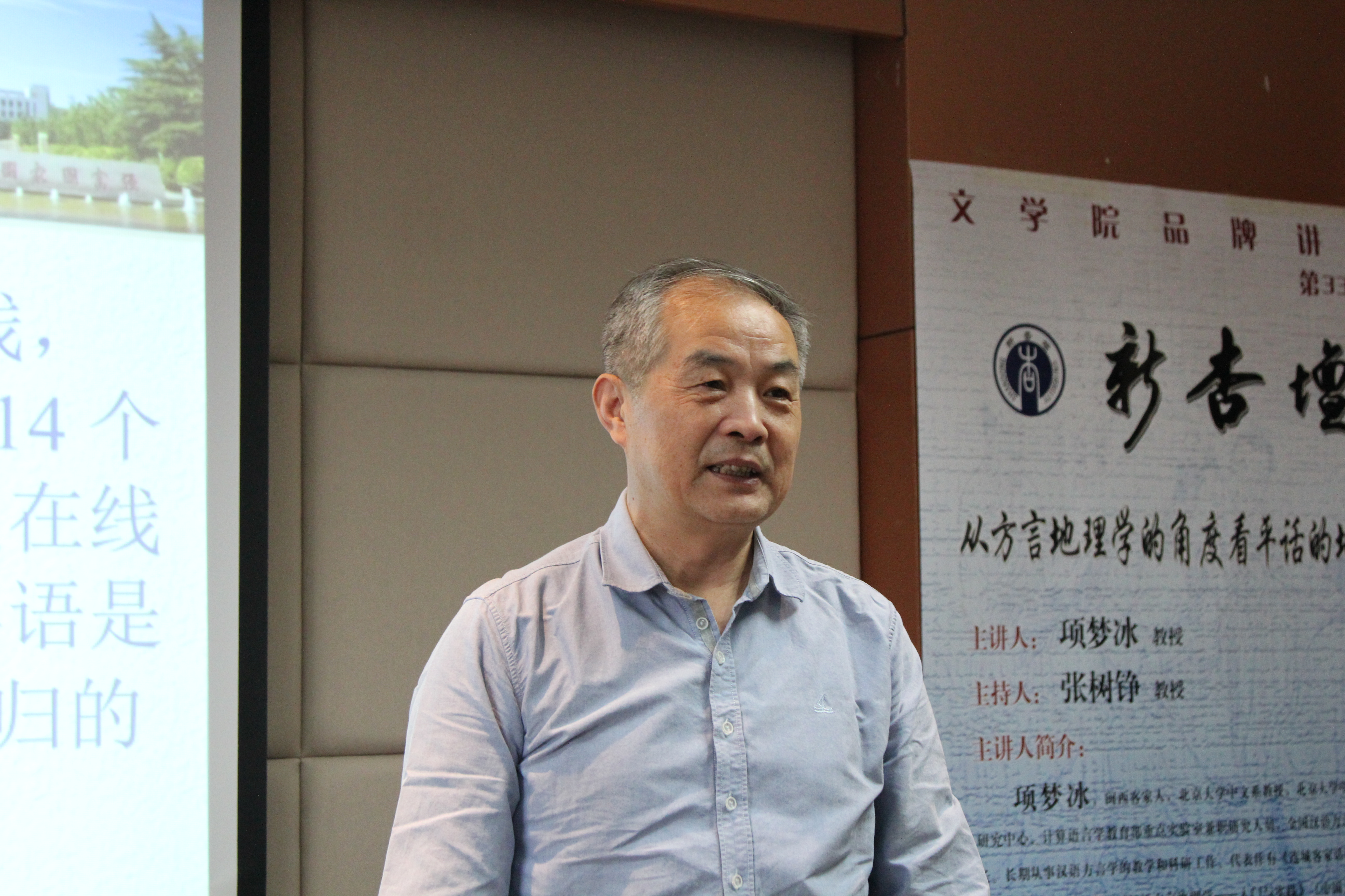 5月11日16时,北京大学中文系教授、北京大学中国语言学研究中心和计算语言学教育部重点实验室兼职研究员、全国汉语方言学会副会长项梦冰教授做客第331期“新杏坛”,于知新楼A620室作题为“从方言地理学的角度看平话的地位”的学术讲座。讲座由张树铮教授主持,岳立静教授、张燕芬副教授、刘娟副教授出席,吸引了三十余名师生前来聆听。
