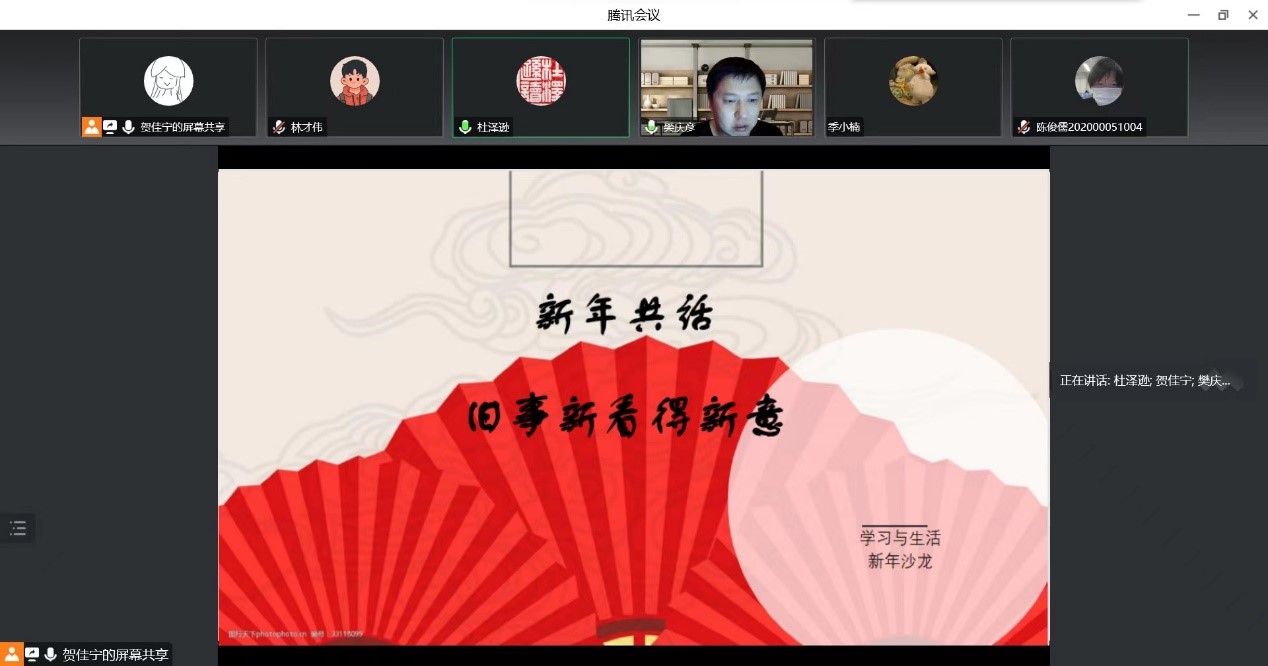 该项活动由杜泽逊经理牵头,邀请了樊庆彦老师、刘阳河老师、赵鑫老师和刘洪超老师和同学们一起交流分享。此次活动由贺佳宁同学担任主持,徐宗文同学负责海报制作,主要分为三个环节。首先是老师们对自己作出介绍,使同学们对自己不熟悉的老师有初步了解。紧接着是同学们的自主发言与师生问答。在这一环节中,同学们积极参与,徐宗文同学、吴子璇同学、王舒桐同学、林才伟同学、徐琦瑛同学、李文清同学、陶禹含同学、贺佳宁同学、夏郗同学、徐晓峰同学和王增雨同学与大家分享了自己的感悟,总结了自己一年的学习与生活,对接下来的一年进行了展望,并向老师提出了自己在治学和处世中遇到的困惑,老师们也耐心地给出了解答;参与讨论的同学们类型甚多,从大一本科生到博士生,同学们提出的问题面也涉及甚广,从治学读书到为人处世,有关于自己论文写作中碰到的困难、如何写好一篇论文的初阶问题,有开拓思维、放眼中外、关于如何阅读外国诗歌和外国学人研究汉学的认知问题,也有联系古今、关于古代文学中女性文学研究的态度问题,还有面向社会、关于老员工激烈竞争的现象成因分析,更有体察个人之情感、关于老师们的方向选择、治学经验乃至兴趣爱好的分享,以及对于治学工具运用的探讨……同学们认真总结自己在2022年的过往,开心地和老师同学们分享自己的感悟,虚心向老师们提出问题,一并展望自己的2023年。五位老师认真倾听了同学们的发言,依托自己的研究领域,结合自己治学处世的经验给同学们作出了耐心细致的回答,用人生的智慧和阅历解答了同学们的疑惑。在此项活动中,大家以“云端”的形式实现了共聚,在相互的分享交流中获得新知,碰撞出思想的火花,不论师生都收获颇多。第三个环节是杜泽逊经理的总结致辞。他以极其亲切温和的态度总结了此次活动,指出了此次活动对于大家开拓思维、增长见识、更好进行新年规划的重要意义。至此,此次的“新年共话 旧事新看得新意”主题沙龙活动圆满结束。
