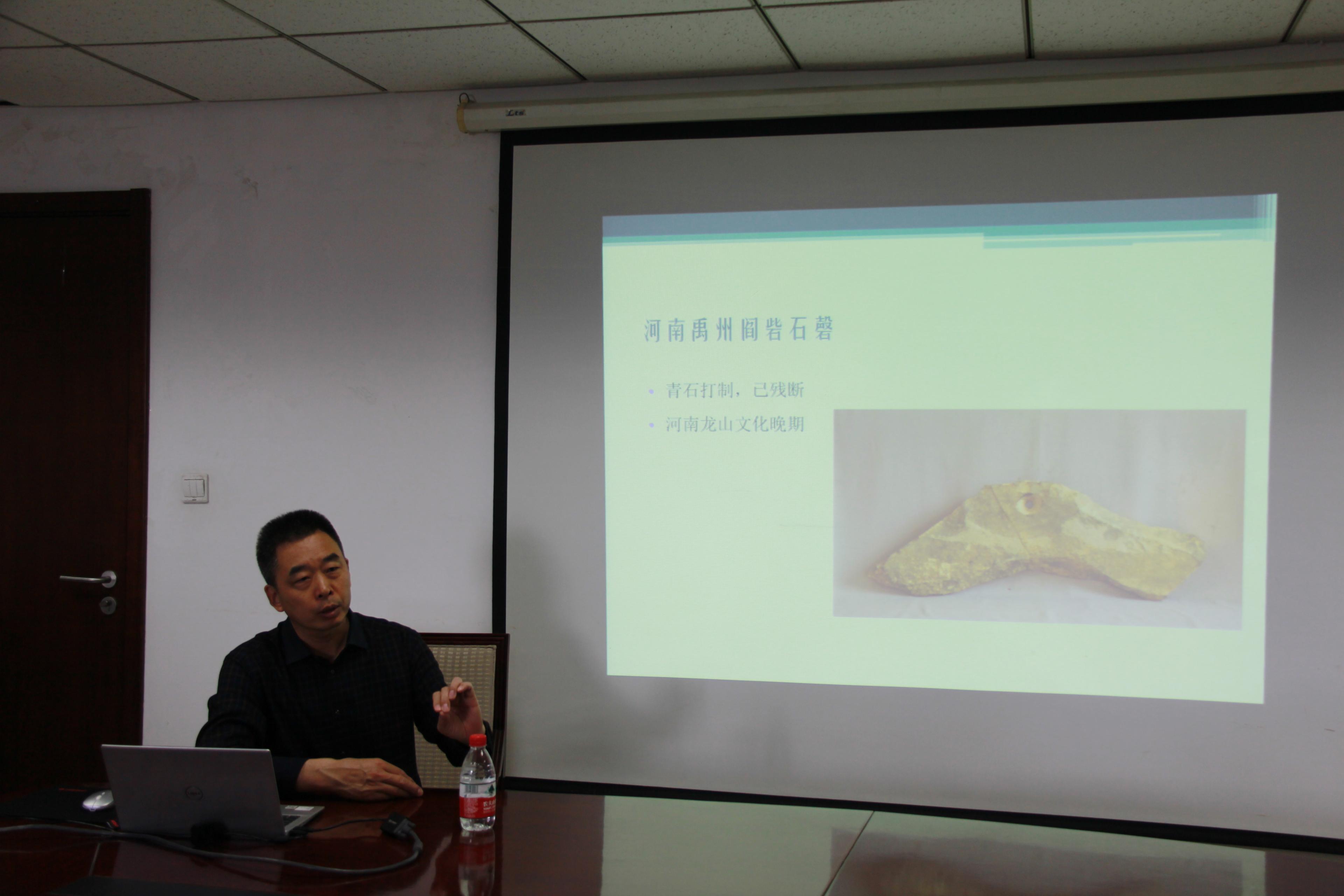 陈教授接着详细讲述了钟和磬两种乐器的发展过程。在讲述过程中,陈教授多次采用出土文物的图片资料为大家讲解乐器在特定发展时期的特点及变化。比如,安阳殷墟出土“中铙”:出土的铙大多数是三个一套(目前发现的仅有殷墟妇好墓为五件套),证明乐器开始编列化,可以演奏简单乐曲。