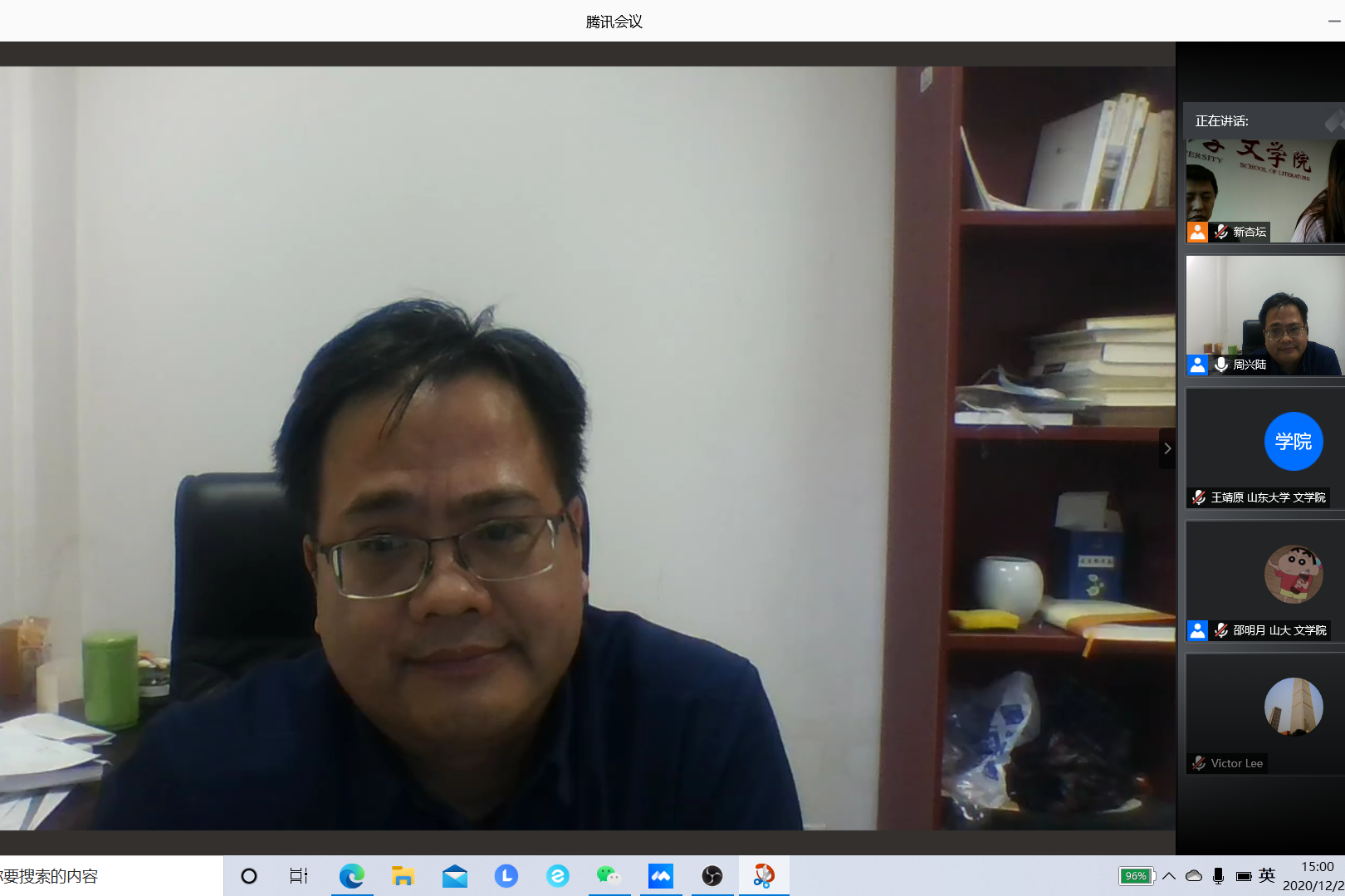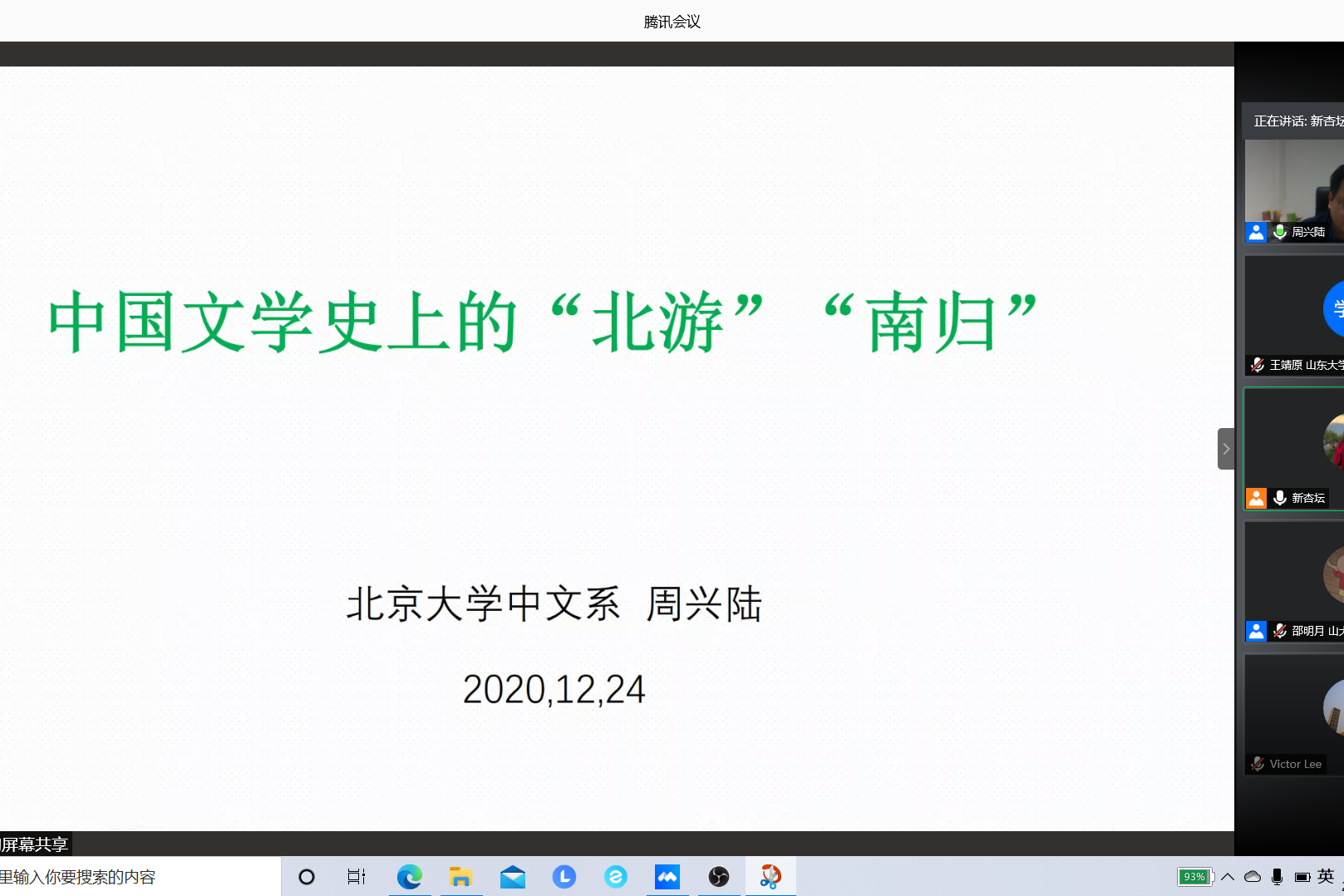 12月25日15时,北京大学中文系博士生导师周兴陆教授做客“新杏坛”,作题为“中国文学史上的北游南归”的学术讲座。本场讲座由beats365唯一官方网站樊庆彦教授主持,通过腾讯会议线上直播,beats365唯一官方网站李剑锋教授、李桂奎教授,BEAT365英国官网网站国际教育学院朱家英老师,燕山大学郑艳玲教授,江苏大学杨贵环教授,齐鲁师范学院杨峰教授等校内外一百三十余名师生共同参与。