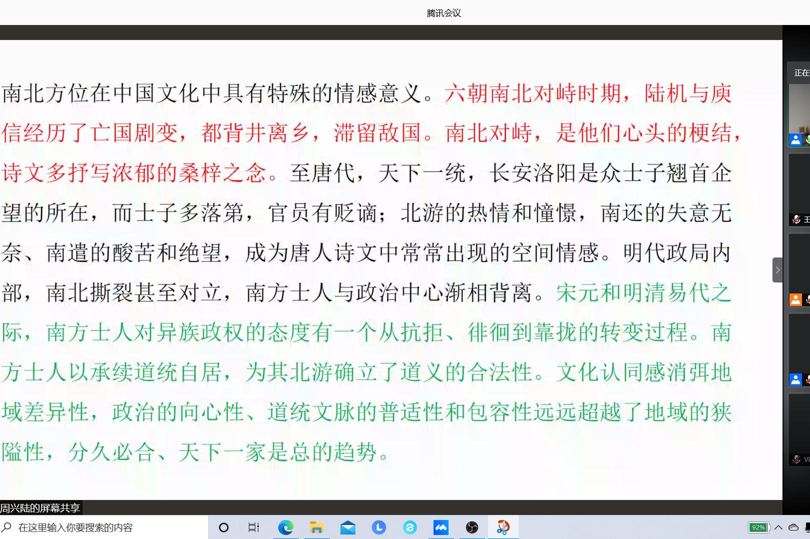 在讲座的主体部分,周教授认为,南北方位在中国文化中具有特殊的情感意义,是为华夷之辨、出处冲突的政治文化隐喻。他选取三个具有代表性的历史时段,具体阐述“北游南归”的文学史现象。最后得出结论:文化认同感消弭地域差异性,政治的向心性、道统文脉的普适性和包容性远远超越了地域的狭隘性,分久必合、天下一家是总的趋势。