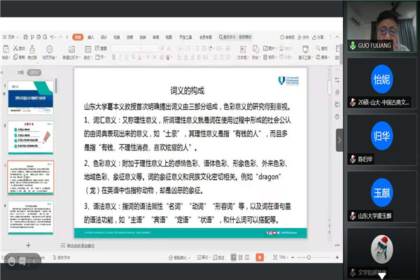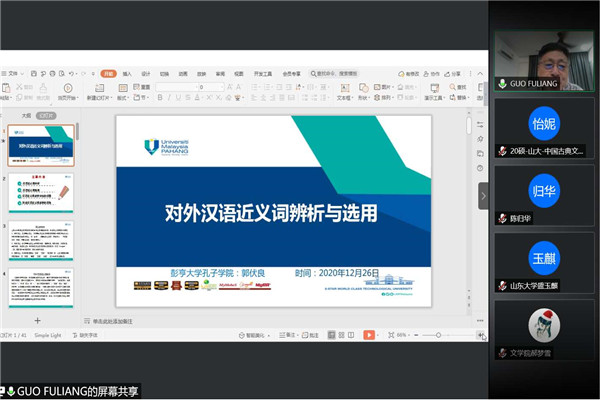 12月26日19时,马来西亚彭亨大学孔子学院中方经理、河北大学教授郭伏良做客“新杏坛”,作题为“对外汉语近义词的辨析与选用——以马来西亚华文报刊为例”的学术讲座。讲座由BEAT365英国官网网站教授盛玉麒主持,通过腾讯会议线上举行,吸引了校内外众多师生参与。讲座开始前,盛玉麒对郭伏良的到来表示热烈欢迎,并简单介绍了郭伏良的研究领域和学术成就。