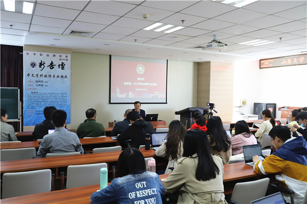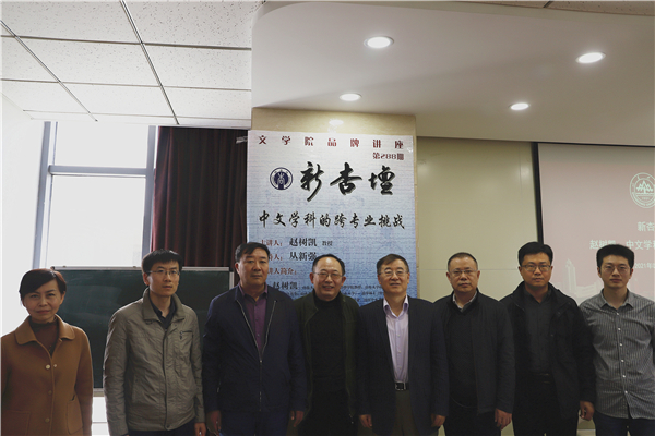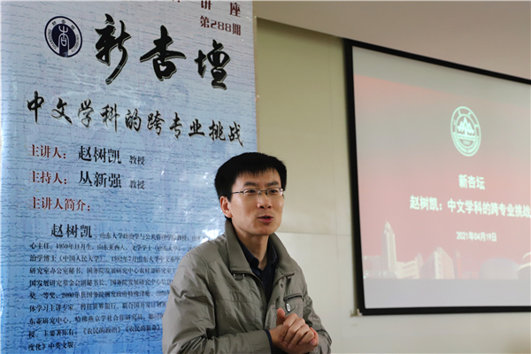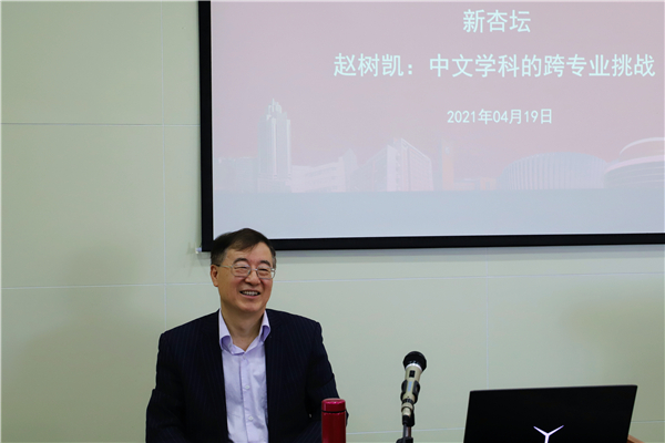 4月19日上午,BEAT365英国官网网站政治学与公共管理学院特聘教授、BEAT365英国官网网站政府决策研究中心主任赵树凯做客“新杏坛”,在知新楼A606室作学术讲座,题为“中文学科的跨专业挑战”。讲座由beats365唯一官方网站丛新强教授主持,现当代文学教研室刘方政、叶诚生、史建国、邵部等诸位老师和新闻传播学院冯炜老师、院办主任沈文老师以及四十余位同学共同参与了活动。