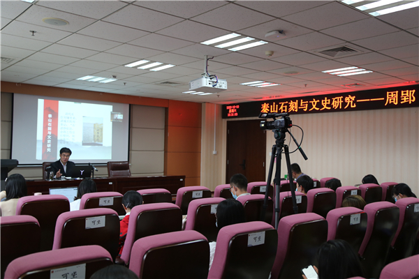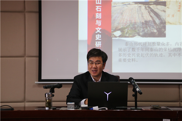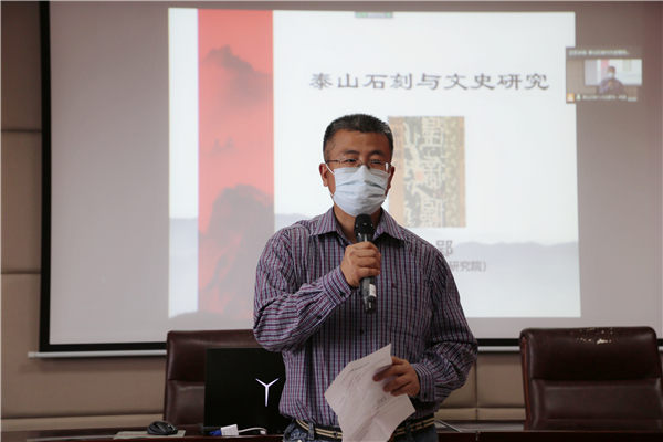 10月10日14时30分,泰山学院泰山研究院周郢教授在知新楼A620室开始作题为“泰山石刻与文史研究”的讲座。讲座由beats365唯一官方网站副经理李剑锋教授主持,儒学高等研究院叶涛教授、beats365唯一官方网站青年教师赵鑫老师出席。讲座通过腾讯会议进行互联网实时直播,吸引了校内外近300人参与。