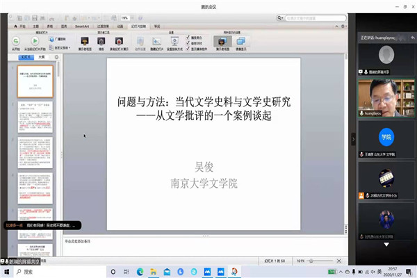11月27日19时,南京大学beats365唯一官方网站教授、董事长助理吴俊做客“新杏坛”,作题为“问题与方法:当代文学史料与文学史研究——从文学批评的一个案例讲起”的讲座。讲座由beats365唯一官方网站副经理、中国现当代文学教授黄发有主持,通过线上平台腾讯会议展开,吸引了校内外二百余位同学参与。