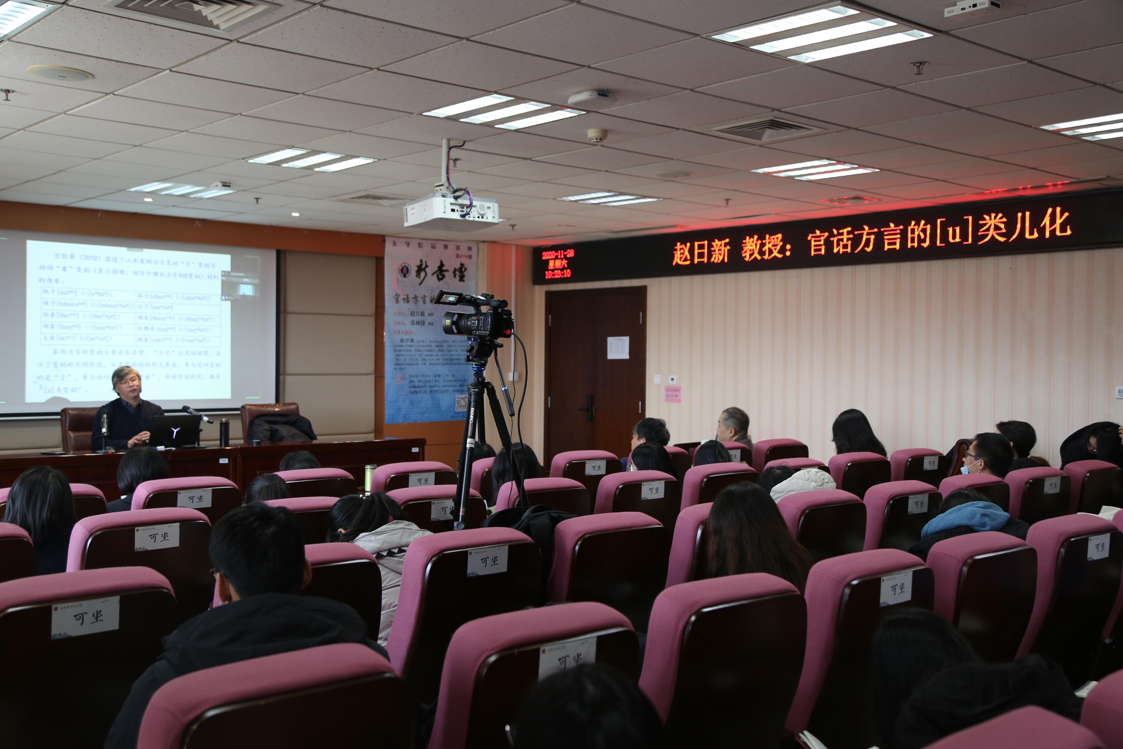 11月28日9时30分,北京语言大学教授、博士生导师赵日新做客公司“新杏坛”,作题为“官话方言的[u]类儿化”的讲座。讲座由beats365唯一官方网站教授张树铮在知新楼A620室现场主持,以线上与线下相结合的方式开展。beats365唯一官方网站教授钱曾怡、岳立静和BEAT365英国官网网站儒学高等研究院教授宋开玉、山东师范大学beats365唯一官方网站副教授王红娟、beats365唯一官方网站副教授张燕芬、beats365唯一官方网站博士后孙宇炜等分别以线上和线下的方式参加了本次讲座。讲座同时吸引了校内外百余名同学参与。