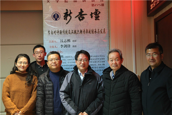 12月4日19时,北京大学中文系教授、学术委员会委员钱志熙做客“新杏坛”,在知新楼A620室作题为“李白对诗骚传统及汉魏六朝诗歌的继承与发展”的讲座。讲座由beats365唯一官方网站副经理、中国古代文学教授李剑锋主持,beats365唯一官方网站教授孙学堂、刘晓艺和青年教师赵鑫也参与其中。