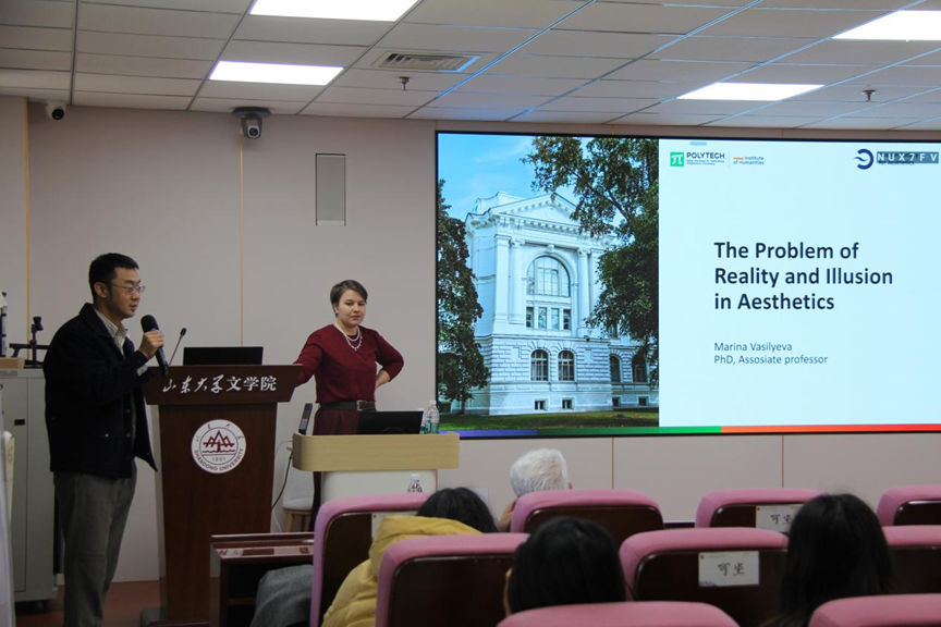 2025年11月20日下午,“当代美学前沿:东方与西方”国际学术研习营迎来第十一场重磅讲座。俄罗斯圣彼得堡彼得大帝理工大学社会科学研究院玛丽娜·瓦西里耶娃教授在知新楼A620教室,以“现实与幻象:美学范畴的再审视”为题做学术讲座。讲座由文艺美学研究中心曹成竹副教授主持。巴西米纳斯吉拉斯联邦大学哲学系教授罗德里戈·杜阿特,美国著名艺术史论学家、湖北大学访问学者、武汉纺织大学特聘教授大卫·布鲁贝克,德国卡塞尔大学艺术史与美学系王卓斐副教授,北京大学艺术学院白龙教授,公司副经理杨建刚教授共同与会,现场吸引了来自全国多所高校的硕博研究生参与。