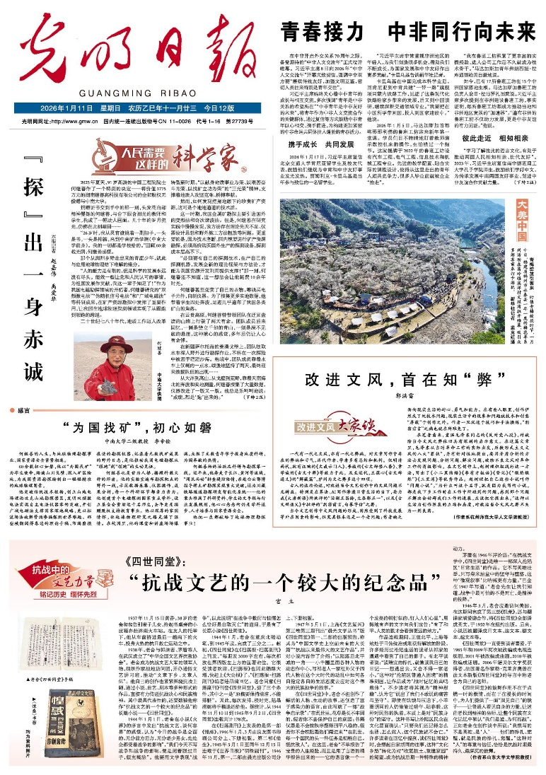 1月11日,公司宫立教授在《光明日报》头版“铭记历史 缅怀先烈·抗战中的文艺力量”专栏发表了题为《〈四世同堂〉:“抗战文艺的一个较大的纪念品”》的文章。