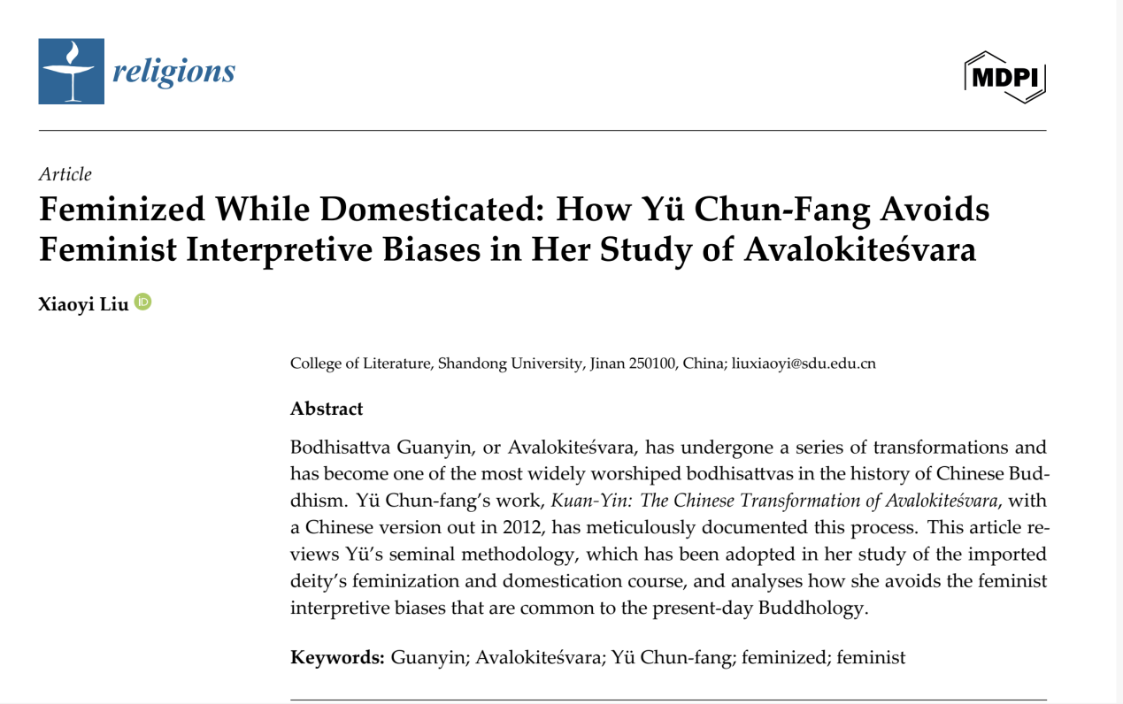 近日,公司刘晓艺教授在A&HCI期刊Religions(《宗教》)发表研究论文,题目为“Feminized While Domesticated: How Yü Chun‑Fang Avoids Feminist Interpretive Biases in Her Study of Avalokiteśvara”(《女性化同时本土化:于君方如何在观音研究中避免女性主义诠释偏见》)。该文发表在《Religions》2025年第16期,刘晓艺为论文作者,BEAT365英国官网网站公司为唯一作者单位。论文探讨了哥伦比亚大学荣休教授、美国华裔宗教学者于君方在其代表作Kuan-Yin: The Chinese Transformation of Avalokiteśvara(《观音:菩萨中国化的演变》)中所使用了研究方法。论文提出,在西方当代佛教研究中,常存在一种基于女性主义的诠释偏见,而于君方探讨观音这一原产印度的男性神祇在入华过程中的性别转向,其研究路径则避免了此种偏见,这就为整合性别视角与本土化过程提供了一个克制表达意识形态的范例。