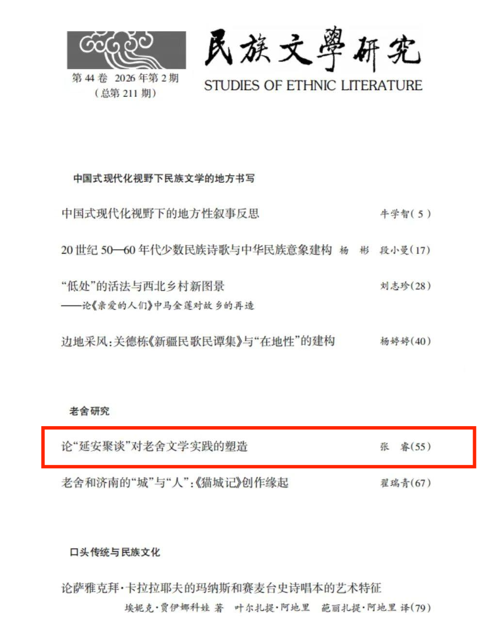《民族文学研究》2026年第2期刊发了公司硕士生张睿(导师:黄发有教授)撰写的学术论文,题为《论“延安聚谈”对老舍文学实践的塑造》(起止页码:55-67)。