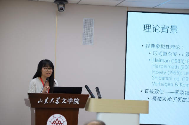 句法语义分会场上,十余位研究生围绕领域前沿议题展开了兼具理论深度、方法创新与实践价值的学术报告。报告以汉语本体研究为核心,立足语言类型学、构式语法等理论框架,聚焦谓词性领属范畴、疑问句结构、动趋式构式、因果关联标记等议题,综合运用历时溯源、跨语言对比、量化分析等方法,系统厘清相关语言单位的句法语义特征与演化机制。多项研究立足互动语言学视角,考察典型话语标记的语用功能与自然会话的多模态互动机制。亦有实证研究结合眼动实验、语料库统计等,围绕二语习得加工、汉语教学应用等议题展开分析,为相关教学实践优化提供了坚实的实证参考。