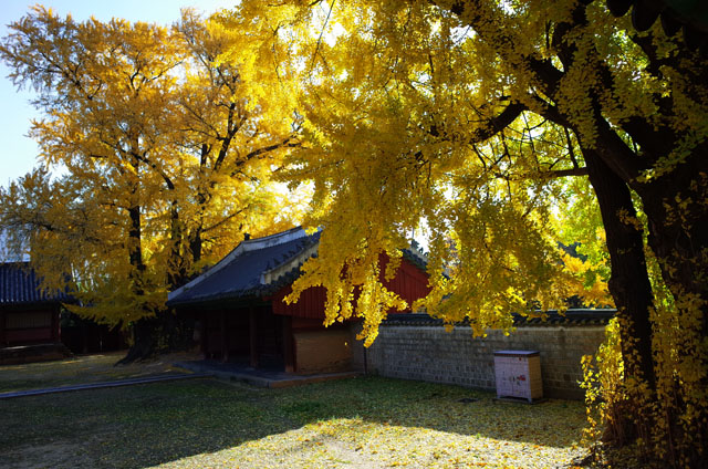 成均馆成立于1398年,是朝鲜王朝的最高国立教育机关,也是韩国教育的发源地。成均馆大学含有两个校区,自然科学校区位于首尔的卫星城水原市,由作为学校财团的三星集团投资建设;首尔市内的本校则变成了人文与社会科学校区。在本校区内,有至今保存完好的文庙。每年在孔子诞生日都要举行祭孔大典,一众师生盛装列队,击鼓鸣琴,作八佾之舞。据说一招一势皆取自曲阜孔庙所演大礼。来自各地教育部门的官员和教师或坐或立,肃然围观。作为看客伫立期间,冥思恍惚,一时竟不知身在何处。然而奇怪的是,文庙里平日却是异常清静,虽与校园只一墙之隔,且庙门昼夜开放,但极少看到师生的身影,倒是成群的鸽子四处觅食,给人门可罗雀的感受。刚来时我对此也有所不解,但后来看到校园里员工匆匆的脚步和漠然的神情,多少知道了些原因。在韩国,青年人的生活压力大、生活节奏快,员工们除了完成学业,还要打工挣钱。长期休息不好、睡眠不足,少有闲情逸致停下来看一眼周围的风景。说到风景,其实文庙里的两棵千年银杏树甚为可观,深秋时节,满树金黄。顺带提一句,成均馆大学的校徽图案就是一枚银杏树叶。